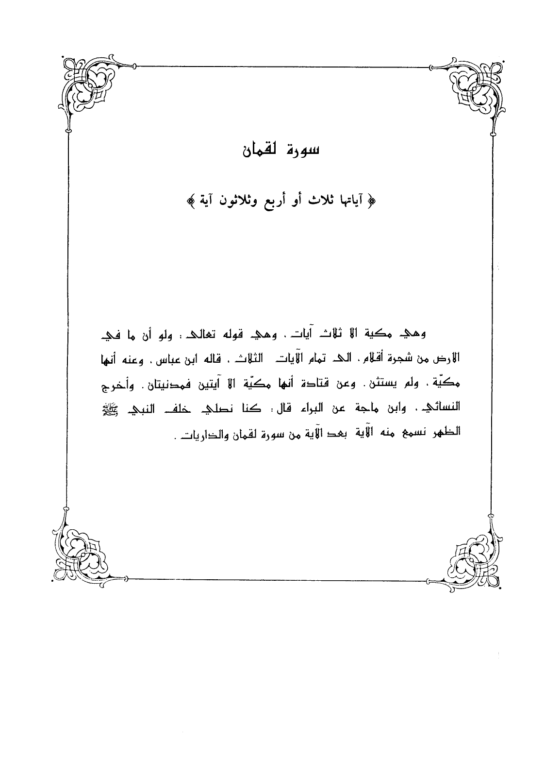وهي مكية إلا ثلاث آيات، وهي قوله تعالى: (ولو أن ما في الأرض من شجرة أقلام)، إلى تمام الآيات الثلاث، قاله ابن عباس، وعنه أنها مكيّة، ولم يستثن، وعن قتادة أنها مكيّة إلا آيتين فمدنيتان، وأخرج النسائي، وابن ماجة عن البراء قال: كنا نصلي خلف النبي - صلى الله عليه وسلم - الظهر نسمع منه الآية بعد الآية من سورة لقمان والذاريات.