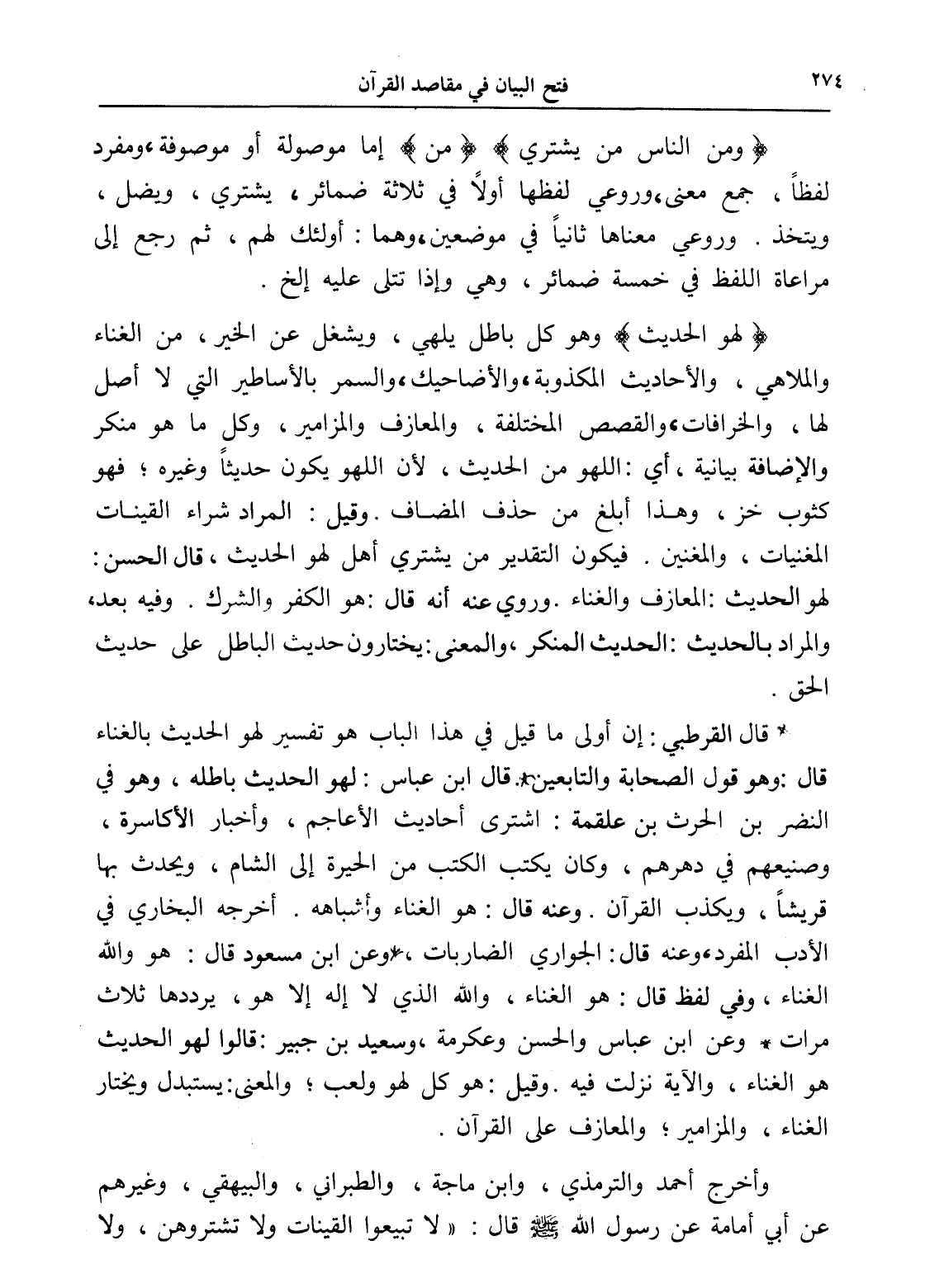 " قال القرطبي: إن أولى ما قيل في هذا الباب هو تفسير لهو الحديث بالغناء قال: وهو قول الصحابة والتابعين. قال ابن عباس: لهو الحديث باطله، وهو في النضر بن الحرث بن علقمة: اشترى أحاديث الأعاجم، وأخبار الأكاسرة، وصنيعهم في دهرهم، وكان يكتب الكتب من الحيرة إلى الشام، ويحدث بها قريشاً، ويكذب القرآن. وعنه قال: هو الغناء وأشباهه. أخرجه البخاري في الأدب المفرد، وعنه قال: الجواري الضاربات، وعن ابن مسعود قال: هو والله الغناء، وفي لفظ قال: هو الغناء، والله الذي لا إله إلا هو، يرددها ثلاث مرات، وعن ابن عباس والحسن وعكرمة، وسعيد بن جبير: قالوا لهو الحديث هو الغناء، والآية نزلت فيه. وقيل: هو كل لهو ولعب؛ والمعنى: يستبدل ويختار الغناء، والمزامير؛ والمعازف على القرآن.