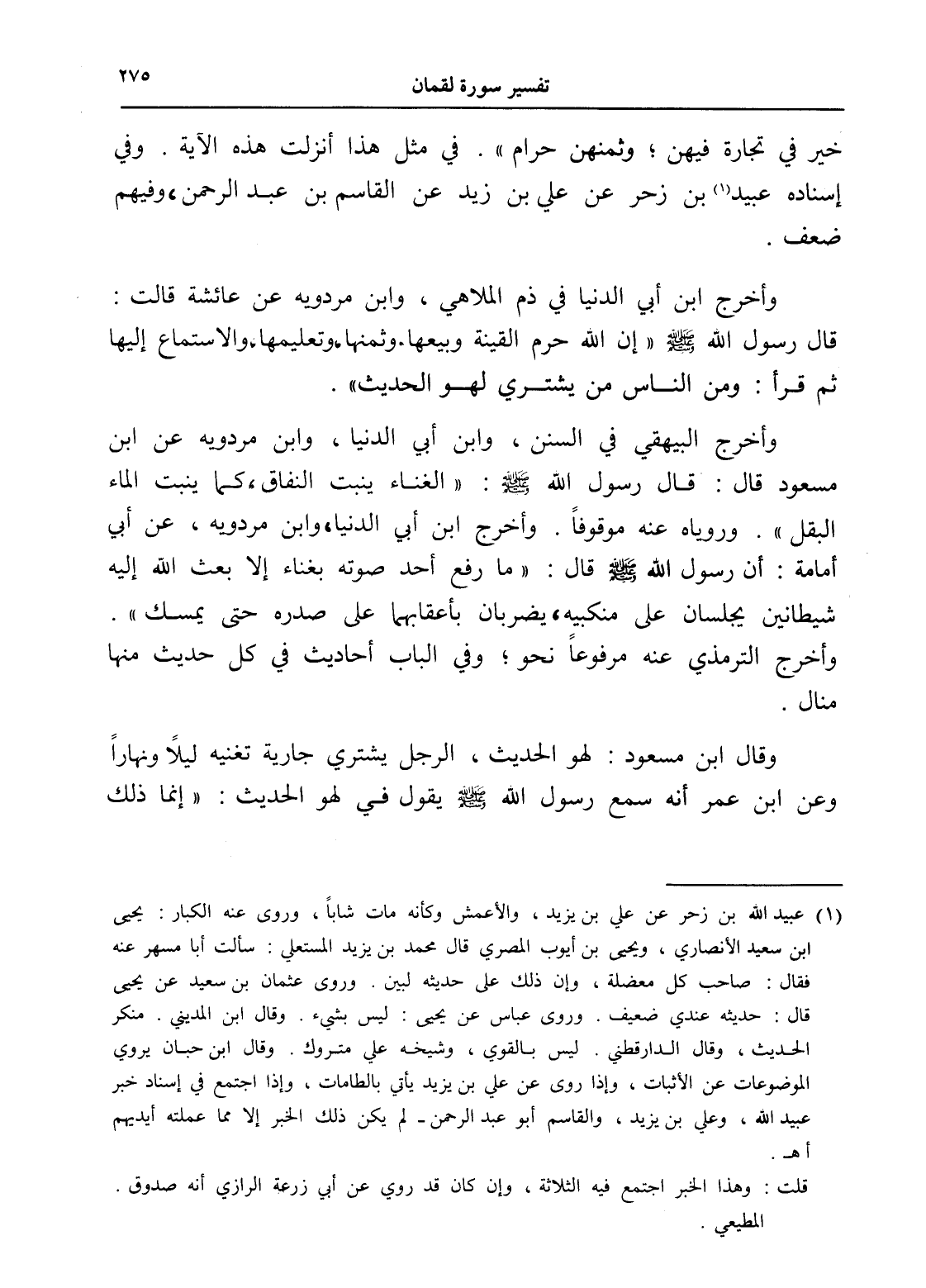 وقال ابن مسعود: لهو الحديث، الرجل يشتري جارية تغنيه ليلاً ونهاراً وعن ابن عمر أنه سمع رسول الله - صلى الله عليه وسلم - يقول في لهو الحديث: " إنما ذلك