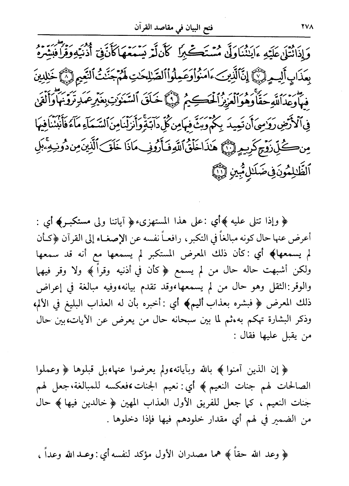 وَإِذَا تُتْلَى عَلَيْهِ آيَاتُنَا وَلَّى مُسْتَكْبِرًا كَأَنْ لَمْ يَسْمَعْهَا كَأَنَّ فِي أُذُنَيْهِ وَقْرًا فَبَشِّرْهُ بِعَذَابٍ أَلِيمٍ (7) إِنَّ الَّذِينَ آمَنُوا وَعَمِلُوا الصَّالِحَاتِ لَهُمْ جَنَّاتُ النَّعِيمِ (8) خَالِدِينَ فِيهَا وَعْدَ اللَّهِ حَقًّا وَهُوَ الْعَزِيزُ الْحَكِيمُ (9) خَلَقَ السَّمَاوَاتِ بِغَيْرِ عَمَدٍ تَرَوْنَهَا وَأَلْقَى فِي الْأَرْضِ رَوَاسِيَ أَنْ تَمِيدَ بِكُمْ وَبَثَّ فِيهَا مِنْ كُلِّ دَابَّةٍ وَأَنْزَلْنَا مِنَ السَّمَاءِ مَاءً فَأَنْبَتْنَا فِيهَا مِنْ كُلِّ زَوْجٍ كَرِيمٍ (10) هَذَا خَلْقُ اللَّهِ فَأَرُونِي مَاذَا خَلَقَ الَّذِينَ مِنْ دُونِهِ بَلِ الظَّالِمُونَ فِي ضَلَالٍ مُبِينٍ (11)