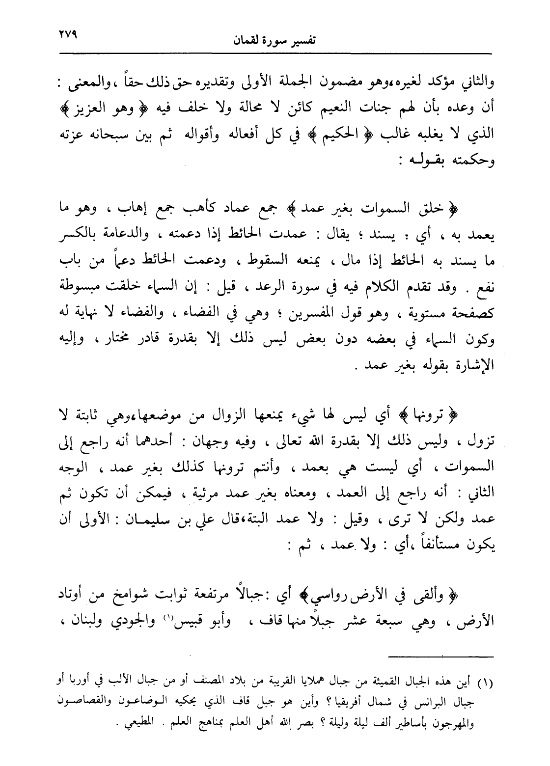 (خلق السماوات بغير عمد) جمع عماد كأهب جمع إهاب، وهو ما يعمد به، أي: يسند؛ يقال: عمدت الحائط إذا دعمته، والدعامة بالكسر ما يسند به الحائط إذا مال، يمنعه السقوط، ودعمت الحائط دعماً من باب نفع. وقد تقدم الكلام فيه في سورة الرعد، قيل: إن السماء خلقت مبسوطة كصفحة مستوية، وهو قول المفسرين؛ وهي في الفضاء، والفضاء لا نهاية له وكون السماء في بعضه دون بعض ليس ذلك إلا بقدرة قادر مختار، وإليه الإشارة بقوله بغير عمد.