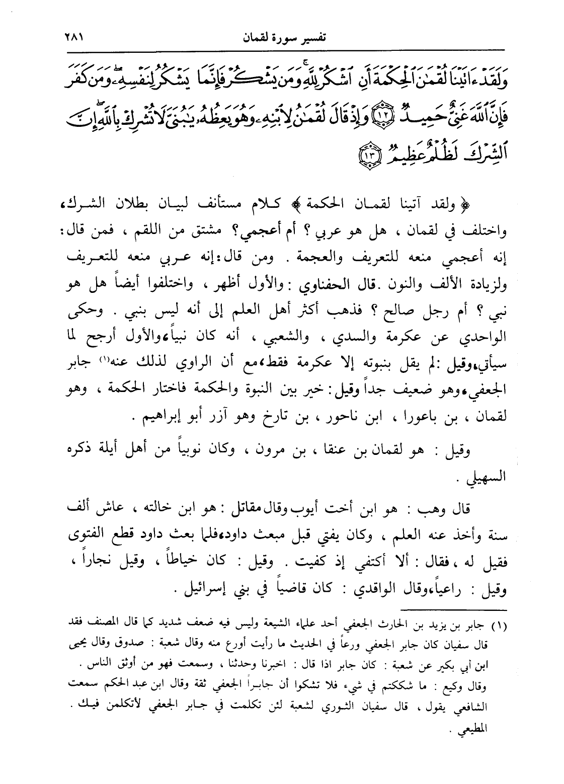 (ولقد آتينا لقمان الحكمة) كلام مستأنف لبيان بطلان الشرك، واختلف في لقمان، هل هو عربي؟ أم أعجمي؟ مشتق من اللقم، فمن قال: إنه أعجمي منعه للتعريف والعجمة. ومن قال: إنه عربي منعه للتعريف ولزيادة الألف والنون. قال الحفناوي: والأول أظهر، واختلفوا أيضاًً هل هو نبي؟ أم رجل صالح؟ فذهب أكثر أهل العلم إلى أنه ليس بنبي. وحكى الواحدي عن عكرمة والسدي، والشعبي، أنه كان نبياً، والأول أرجح لما سيأتي، وقيل: لم يقل بنبوته إلا عكرمة فقط، مع أن الراوي لذلك عنه (¬1) جابر الجعفي، وهو ضعيف جداً وقيل: خير بين النبوة والحكمة فاختار الحكمة، وهو لقمان، بن باعورا، ابن ناحور، بن تارخ وهو آزر أبو إبراهيم.