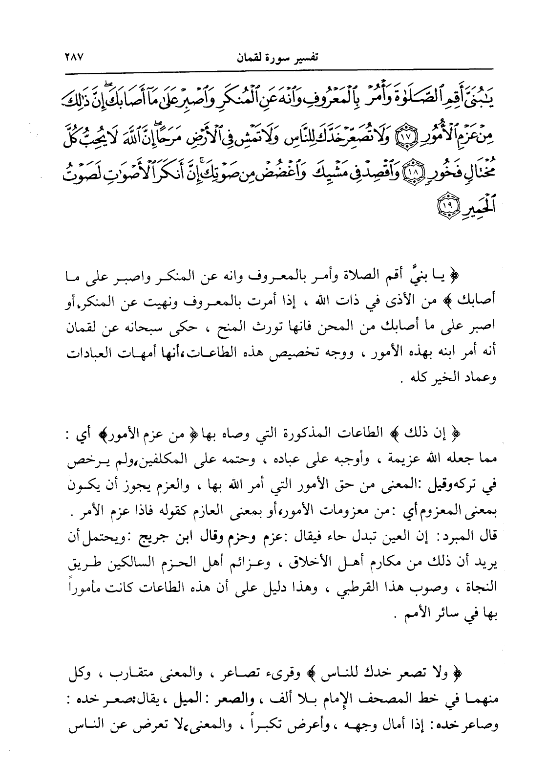 يَا بُنَيَّ أَقِمِ الصَّلَاةَ وَأْمُرْ بِالْمَعْرُوفِ وَانْهَ عَنِ الْمُنْكَرِ وَاصْبِرْ عَلَى مَا أَصَابَكَ إِنَّ ذَلِكَ مِنْ عَزْمِ الْأُمُورِ (17) وَلَا تُصَعِّرْ خَدَّكَ لِلنَّاسِ وَلَا تَمْشِ فِي الْأَرْضِ مَرَحًا إِنَّ اللَّهَ لَا يُحِبُّ كُلَّ مُخْتَالٍ فَخُورٍ (18) وَاقْصِدْ فِي مَشْيِكَ وَاغْضُضْ مِنْ صَوْتِكَ إِنَّ أَنْكَرَ الْأَصْوَاتِ لَصَوْتُ الْحَمِيرِ (19)