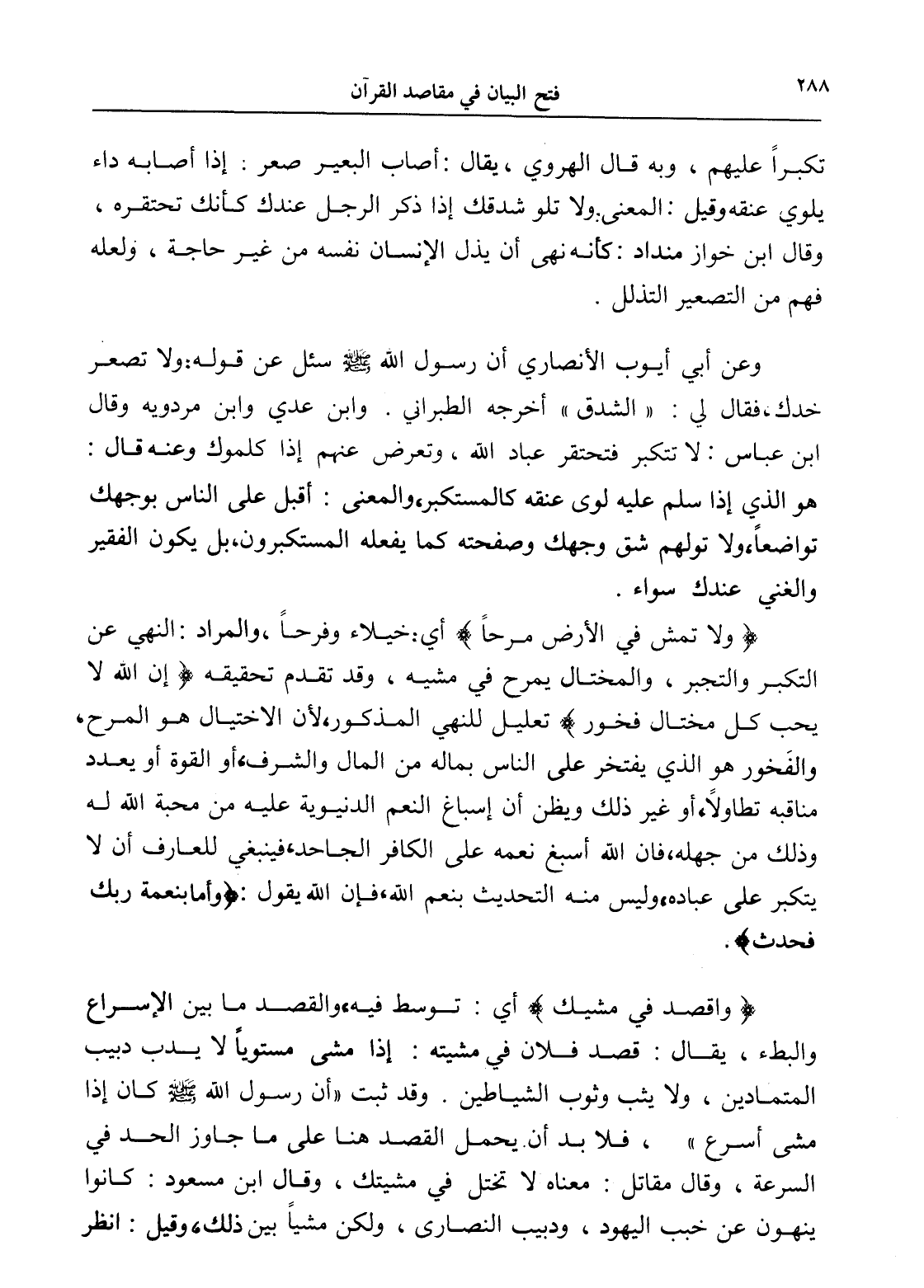 وعن أبي أيوب الأنصاري أن رسول الله - صلى الله عليه وسلم - سئل عن قوله: ولا تصعر خدك، فقال لي: " الشدق " أخرجه الطبراني. وابن عدي وابن مردويه وقال ابن عباس: لا تتكبر فتحتقر عباد الله، وتعرض عنهم إذا كلموك وعنه قال: هو الذي إذا سلم عليه لوى عنقه كالمستكبر، والمعنى: أقبل على الناس بوجهك تواضعاً، ولا تولهم شق وجهك وصفحته كما يفعله المستكبرون، بل يكون الفقير والغني عندك سواء.