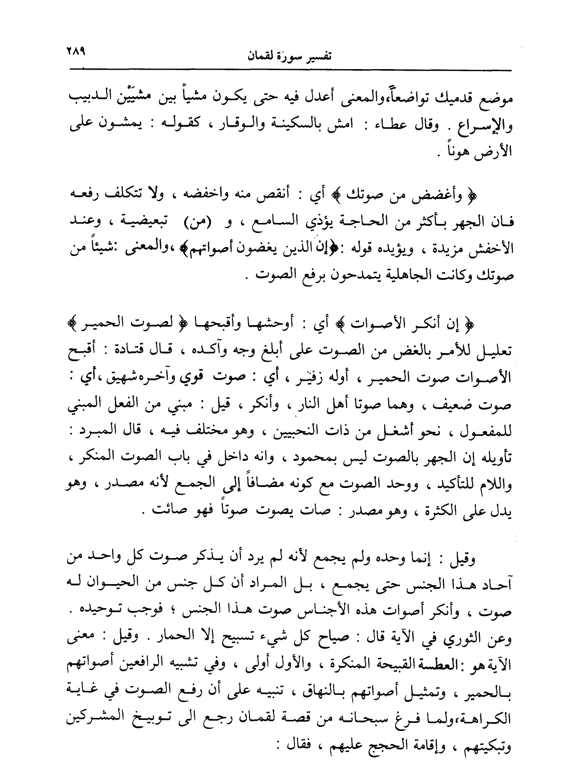 (واغضض من صوتك) أي: أنقص منه واخفضه، ولا تتكلف رفعه فإن الجهر بأكثر من الحاجة يؤذي السامع، و (من) تبعيضية، وعند الأخفش مزيدة، ويؤيده قوله: (إن الذين يغضون أصواتهم)، والمعنى: شيئاًً من صوتك وكانت الجاهلية يتمدحون برفع الصوت.