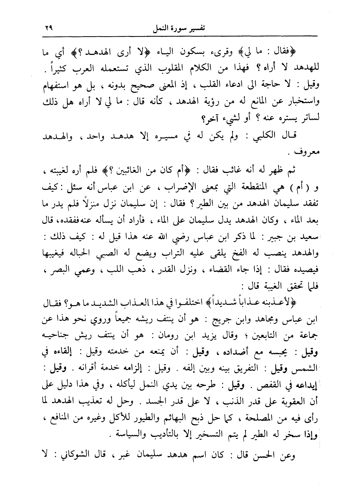 (لأعذبنه عذاباً شديداً) اختلفوا في هذا العذاب الشديد ما هو؟ فقال ابن عباس ومجاهد وابن جريج: هو أن ينتف ريشه جميعاً وروي نحو هذا عن جماعة من التابعين؛ وقال يزيد ابن رومان: هو أن ينتف ريش جناحيه وقيل: يحبسه مع أضداده، وقيل: أن يمنعه من خدمته وقيل: إلقاءه في الشمس وقيل: التفريق بينه وبين إلفه. وقيل: إلزامه خدمة أقرانه. وقيل: إيداعه في القفص. وقيل: طرحه بين يدي النمل ليأكله، وفي هذا دليل على أن العقوبة على قدر الذنب، لا على قدر الجسد. وحل له تعذيب الهدهد لما رأى فيه من المصلحة، كما حل ذبح البهائم والطيور للأكل وغيره من المنافع، وإذا سخر له الطير لم يتم التسخير إلا بالتأديب والسياسة.