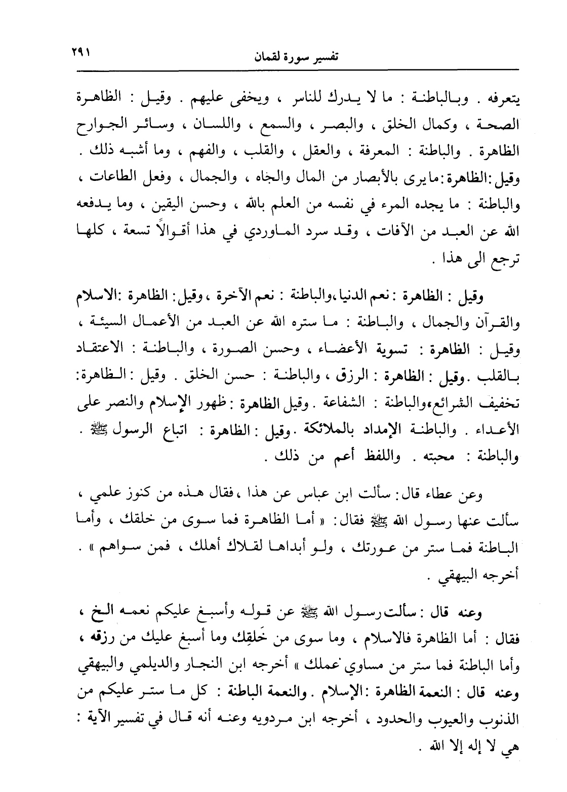 يتعرفه. وبالباطنة: ما لا يدرك للناس، ويخفى عليهم. وقيل: الظاهرة الصحة، وكمال الخلق، والبصر، والسمع، واللسان، وسائر الجوارح الظاهرة. والباطنة: المعرفة، والعقل، والقلب، والفهم، وما أشبه ذلك. وقيل: الظاهرة: ما يرى بالأبصار من المال والجاه، والجمال، وفعل الطاعات، والباطنة: ما يجده المرء في نفسه من العلم بالله، وحسن اليقين، وما يدفعه الله عن العبد من الآفات، وقد سرد الماوردي في هذا أقوالاً تسعة، كلها ترجع إلى هذا.