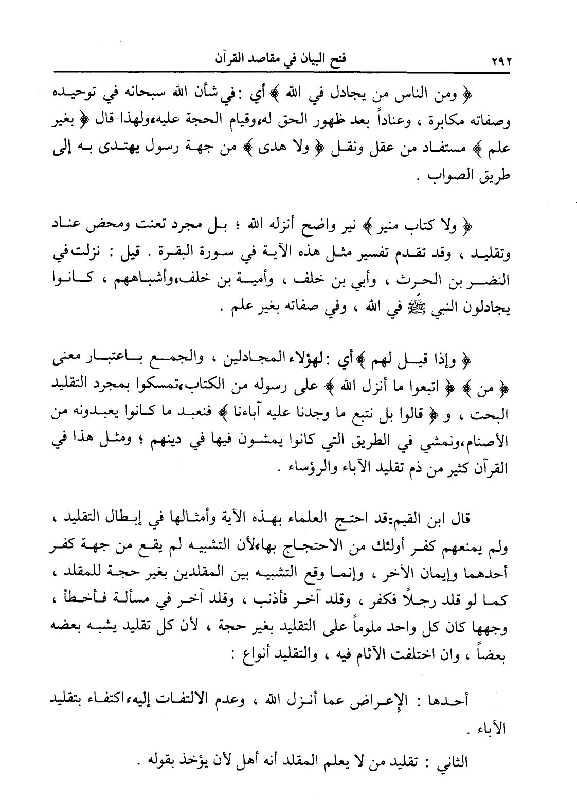 قال ابن القيم: قد احتج العلماء بهذه الآية وأمثالها في إبطال التقليد، ولم يمنعهم كفر أولئك من الاحتجاج بها، لأن التشبيه لم يقع من جهة كفر أحدهما وإيمان الآخر، وإنما وقع التشبيه بين المقلدين بغير حجة للمقلد، كما لو قلد رجلاً فكفر، وقلد آخر فأذنب، وقلد آخر في مسألة فأخطأ، وجهها كان كل واحد ملوماً على التقليد بغير حجة، لأن كل تقليد يشبه بعضه بعضاً، وإن اختلفت الآثام فيه، والتقليد أنواع: