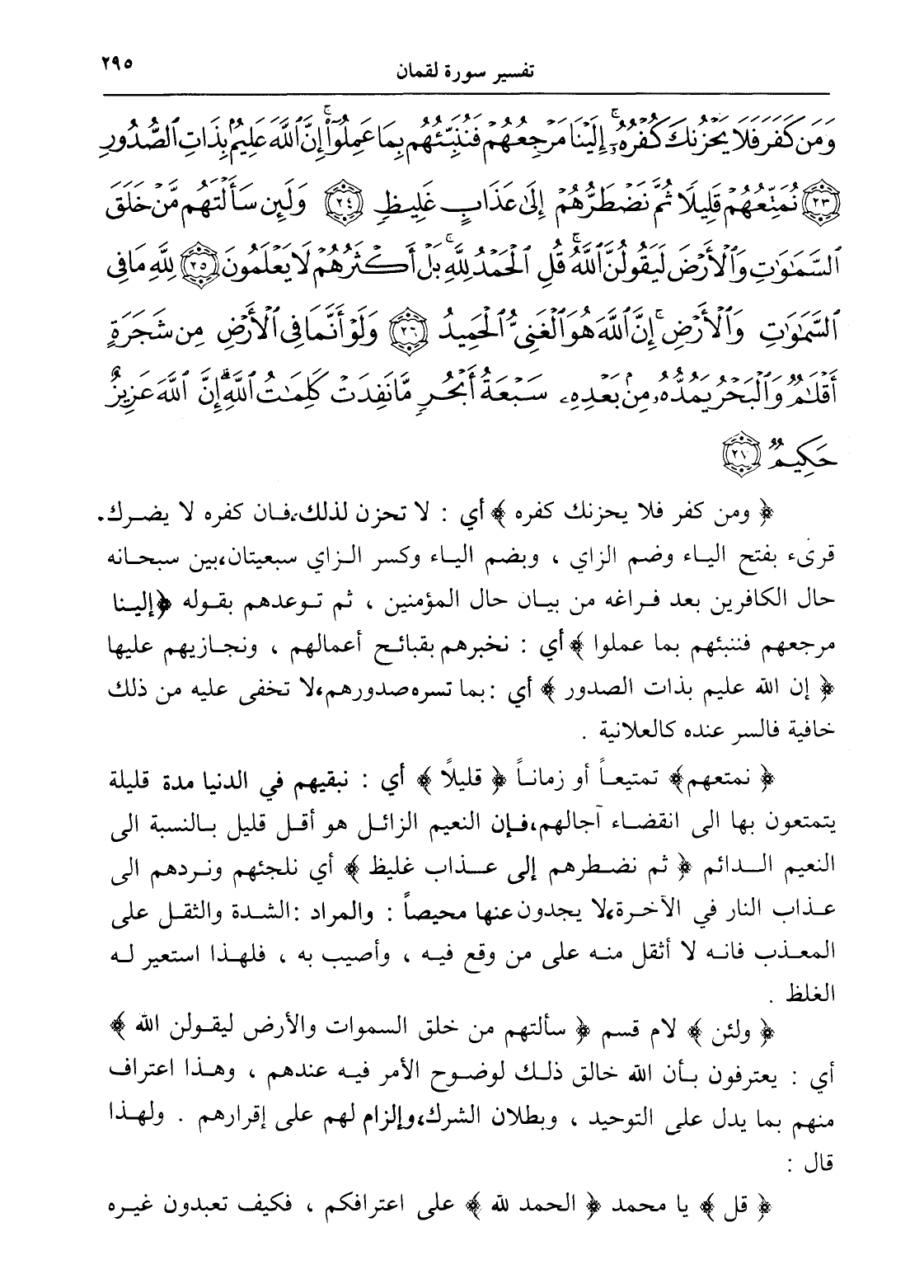 وَمَنْ كَفَرَ فَلَا يَحْزُنْكَ كُفْرُهُ إِلَيْنَا مَرْجِعُهُمْ فَنُنَبِّئُهُمْ بِمَا عَمِلُوا إِنَّ اللَّهَ عَلِيمٌ بِذَاتِ الصُّدُورِ (23) نُمَتِّعُهُمْ قَلِيلًا ثُمَّ نَضْطَرُّهُمْ إِلَى عَذَابٍ غَلِيظٍ (24) وَلَئِنْ سَأَلْتَهُمْ مَنْ خَلَقَ السَّمَاوَاتِ وَالْأَرْضَ لَيَقُولُنَّ اللَّهُ قُلِ الْحَمْدُ لِلَّهِ بَلْ أَكْثَرُهُمْ لَا يَعْلَمُونَ (25) لِلَّهِ مَا فِي السَّمَاوَاتِ وَالْأَرْضِ إِنَّ اللَّهَ هُوَ الْغَنِيُّ الْحَمِيدُ (26) وَلَوْ أَنَّمَا فِي الْأَرْضِ مِنْ شَجَرَةٍ أَقْلَامٌ وَالْبَحْرُ يَمُدُّهُ مِنْ بَعْدِهِ سَبْعَةُ أَبْحُرٍ مَا نَفِدَتْ كَلِمَاتُ اللَّهِ إِنَّ اللَّهَ عَزِيزٌ حَكِيمٌ (27)