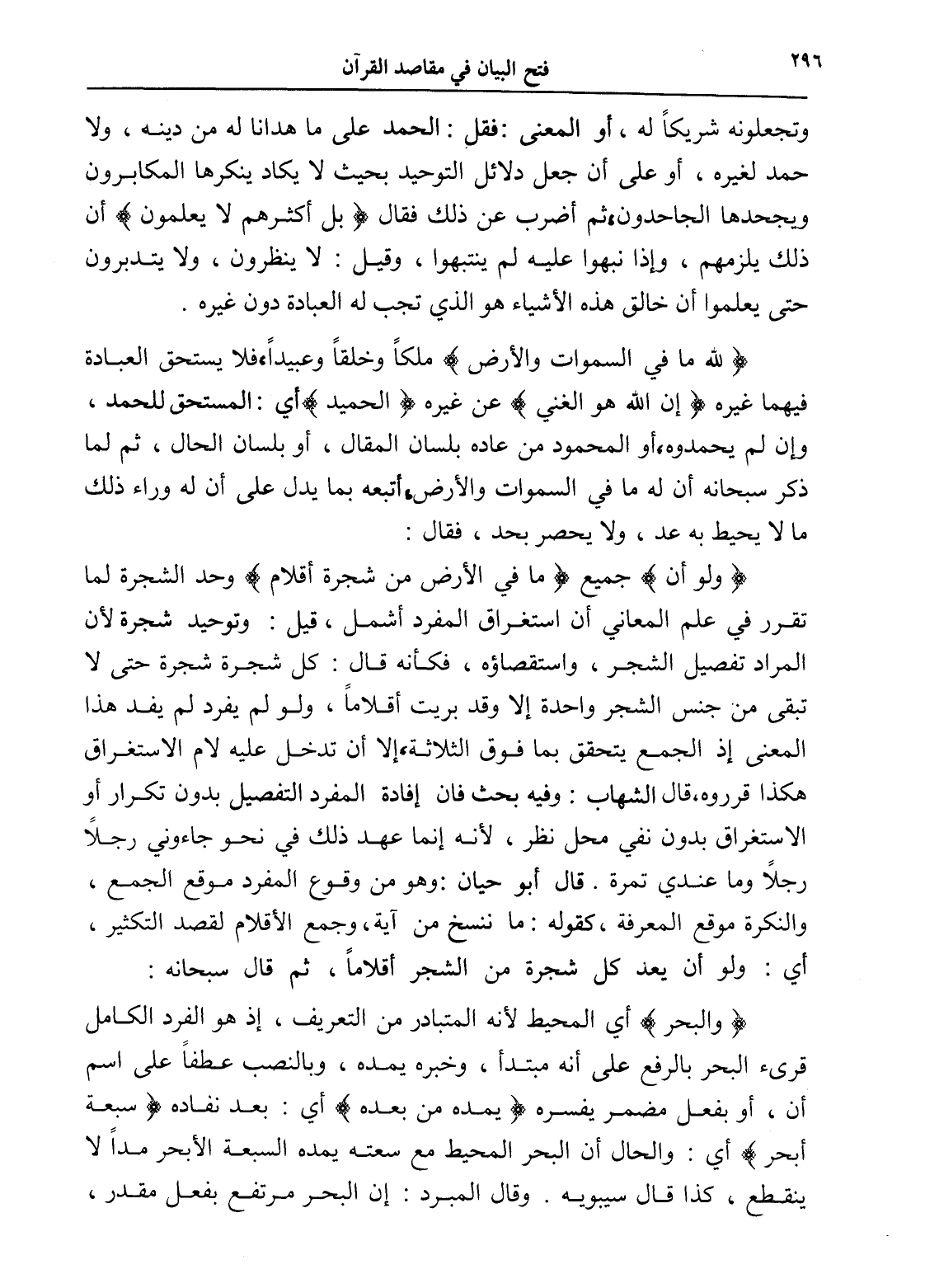 (ولو أن) جميع (ما في الأرض من شجرة أقلام) وحد الشجرة لما تقرر في علم المعاني أن استغراق المفرد أشمل، قيل: وتوحيد شجرة لأن المراد تفصيل الشجر، واستقصاؤه، فكأنه قال: كل شجرة شجرة حتى لا تبقى من جنس الشجر واحدة إلا وقد بريت أقلاماً، ولو لم يفرد لم يفد هذا المعنى إذ الجمع يتحقق بما فوق الثلاثة، إلا أن تدخل عليه لام الاستغراق هكذا قرروه، قال الشهاب: وفيه بحث فإن إفادة المفرد التفصيل بدون تكرار أو الاستغراق بدون نفي محل نظر، لأنه إنما عهد ذلك في نحو جاءوني رجلاً رجلاً وما عندي تمرة. قال أبو حيان: وهو من وقوع المفرد موقع الجمع، والنكرة موقع المعرفة، كقوله: ما ننسخ من آية، وجمع الأقلام لقصد التكثير، أي: ولو أن يعد كل شجرة من الشجر أقلاماً، ثم قال سبحانه: