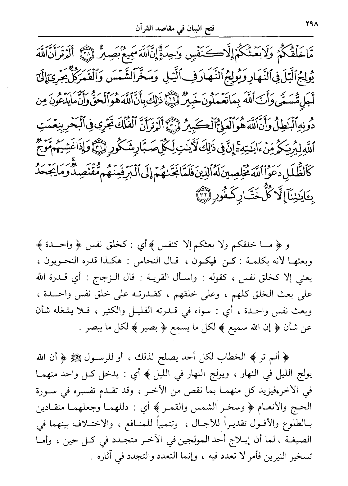 مَا خَلْقُكُمْ وَلَا بَعْثُكُمْ إِلَّا كَنَفْسٍ وَاحِدَةٍ إِنَّ اللَّهَ سَمِيعٌ بَصِيرٌ (28) أَلَمْ تَرَ أَنَّ اللَّهَ يُولِجُ اللَّيْلَ فِي النَّهَارِ وَيُولِجُ النَّهَارَ فِي اللَّيْلِ وَسَخَّرَ الشَّمْسَ وَالْقَمَرَ كُلٌّ يَجْرِي إِلَى أَجَلٍ مُسَمًّى وَأَنَّ اللَّهَ بِمَا تَعْمَلُونَ خَبِيرٌ (29) ذَلِكَ بِأَنَّ اللَّهَ هُوَ الْحَقُّ وَأَنَّ مَا يَدْعُونَ مِنْ دُونِهِ الْبَاطِلُ وَأَنَّ اللَّهَ هُوَ الْعَلِيُّ الْكَبِيرُ (30) أَلَمْ تَرَ أَنَّ الْفُلْكَ تَجْرِي فِي الْبَحْرِ بِنِعْمَتِ اللَّهِ لِيُرِيَكُمْ مِنْ آيَاتِهِ إِنَّ فِي ذَلِكَ لَآيَاتٍ لِكُلِّ صَبَّارٍ شَكُورٍ (31) وَإِذَا غَشِيَهُمْ مَوْجٌ كَالظُّلَلِ دَعَوُا اللَّهَ مُخْلِصِينَ لَهُ الدِّينَ فَلَمَّا نَجَّاهُمْ إِلَى الْبَرِّ فَمِنْهُمْ مُقْتَصِدٌ وَمَا يَجْحَدُ بِآيَاتِنَا إِلَّا كُلُّ خَتَّارٍ كَفُورٍ (32)
