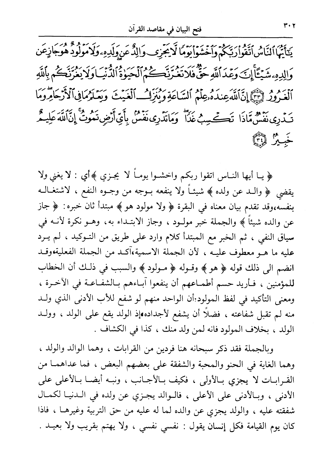يَا أَيُّهَا النَّاسُ اتَّقُوا رَبَّكُمْ وَاخْشَوْا يَوْمًا لَا يَجْزِي وَالِدٌ عَنْ وَلَدِهِ وَلَا مَوْلُودٌ هُوَ جَازٍ عَنْ وَالِدِهِ شَيْئًا إِنَّ وَعْدَ اللَّهِ حَقٌّ فَلَا تَغُرَّنَّكُمُ الْحَيَاةُ الدُّنْيَا وَلَا يَغُرَّنَّكُمْ بِاللَّهِ الْغَرُورُ (33) إِنَّ اللَّهَ عِنْدَهُ عِلْمُ السَّاعَةِ وَيُنَزِّلُ الْغَيْثَ وَيَعْلَمُ مَا فِي الْأَرْحَامِ وَمَا تَدْرِي نَفْسٌ مَاذَا تَكْسِبُ غَدًا وَمَا تَدْرِي نَفْسٌ بِأَيِّ أَرْضٍ تَمُوتُ إِنَّ اللَّهَ عَلِيمٌ خَبِيرٌ (34)