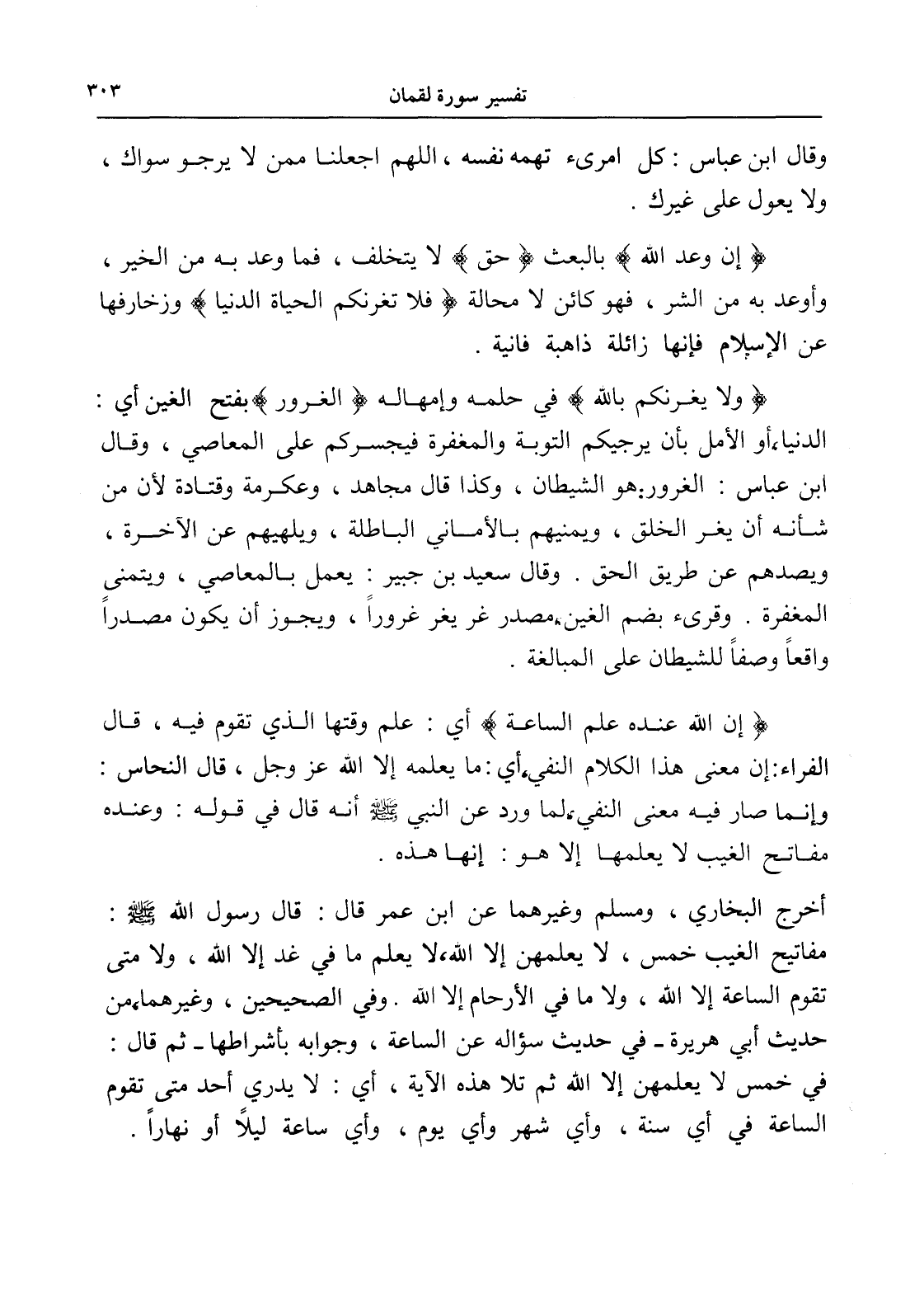 أخرج البخاري، ومسلم وغيرهما عن ابن عمر قال: قال رسول الله - صلى الله عليه وسلم -: مفاتيح الغيب خمس، لا يعلمهن إلا الله، لا يعلم ما في غد إلا الله، ولا متى تقوم الساعة إلا الله، ولا ما في الأرحام إلا الله. وفي الصحيحين، وغيرهما، من حديث أبي هريرة -في حديث سؤاله عن الساعة، وجوابه بأشراطها- ثم قال: في خمس لا يعلمهن إلا الله ثم تلا هذه الآية، أي: لا يدري أحد متى تقوم الساعة في أي سنة، وأي شهر وأي يوم، وأي ساعة ليلاً أو نهاراً.