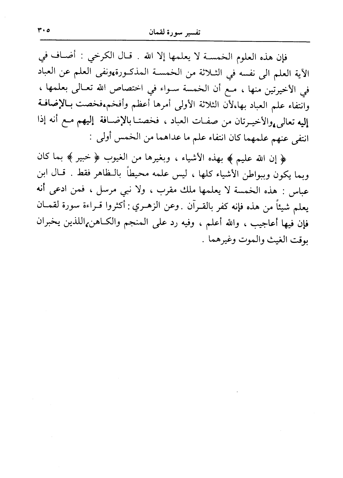 فإن هذه العلوم الخمسة لا يعلمها إلا الله. قال الكرخي: أضاف في الآية العلم إلى نفسه في الثلاثة من الخمسة المذكورة، ونفى العلم عن العباد في الأخيرتين منها، مع أن الخمسة سواء في اختصاص الله تعالى بعلمها، وانتفاء علم العباد بها، لأن الثلاثة الأولى أمرها أعظم وأفخم، فخصت بالإضافة إليه تعالى، والأخيرتان من صفات العباد، فخصتا بالإضافة إليهم مع أنه إذا انتفى عنهم علمهما كان انتفاء علم ما عداهما من الخمس أولى: