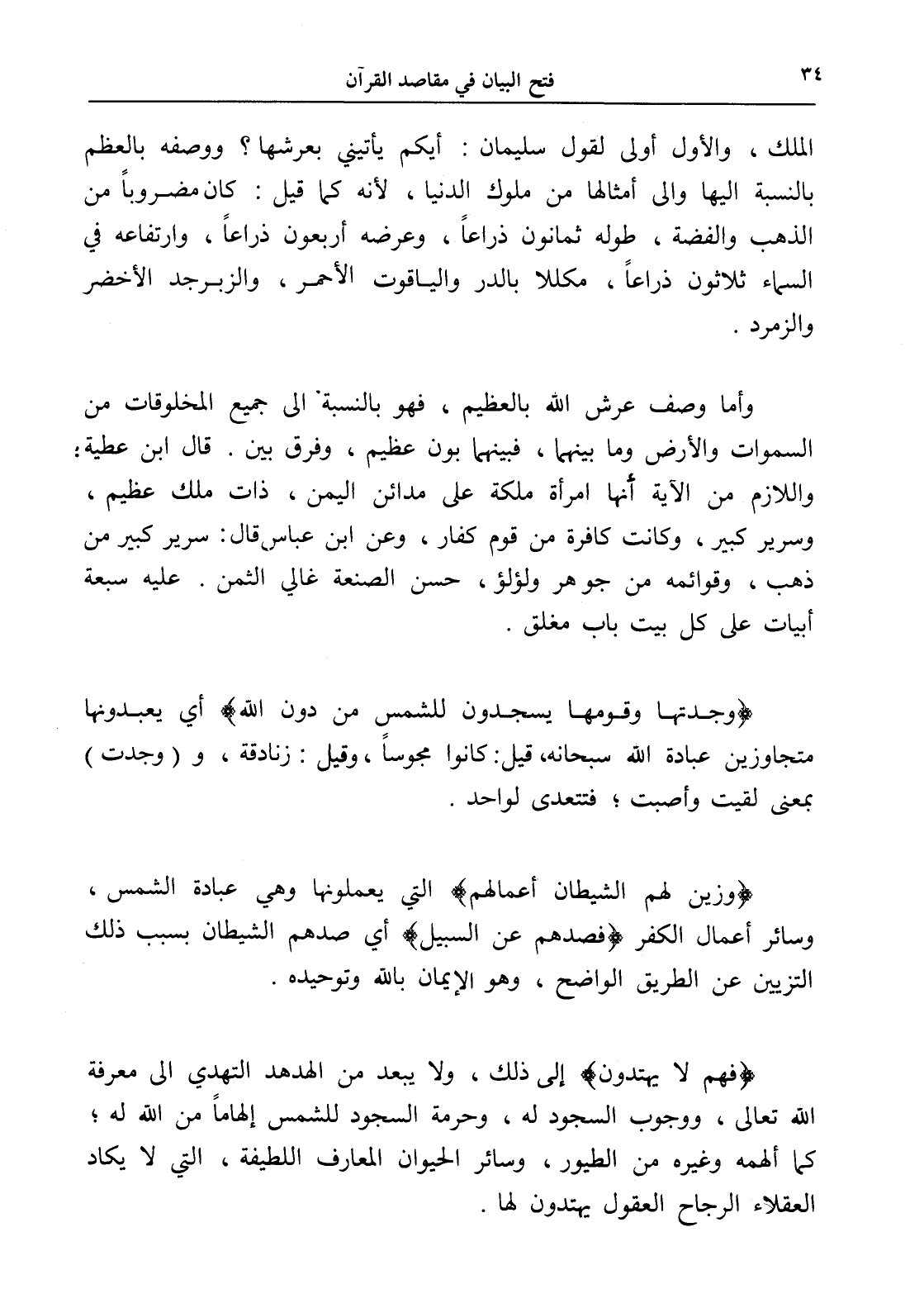 (وجدتها وقومها يسجدون للشمس من دون الله) أي يعبدونها متجاوزين عبادة الله سبحانه، قيل: كانوا مجوساً، وقيل: زنادقة، و (وجدت) بمعنى لقيت وأصبت؛ فتتعدى لواحد.