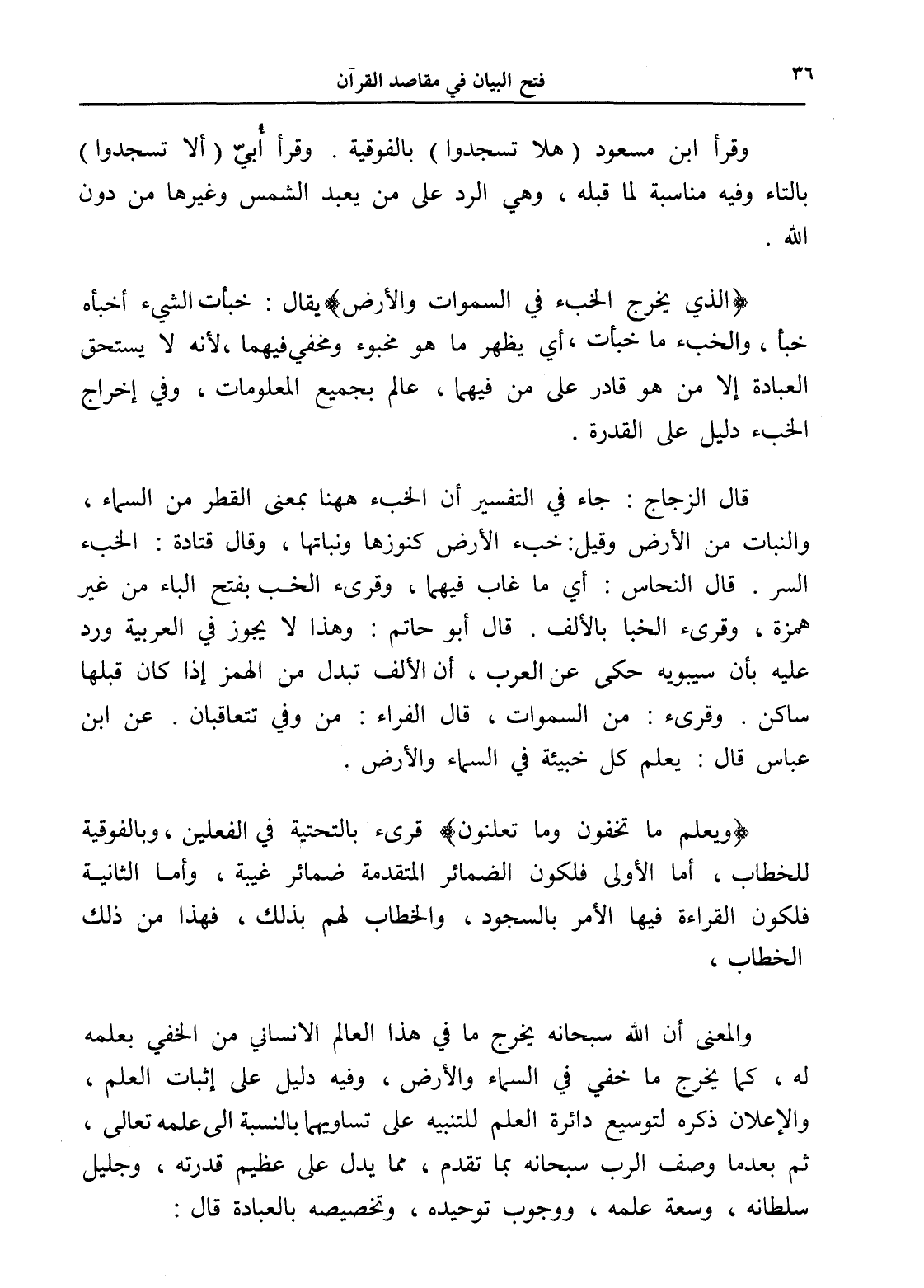 قال الزجاج: جاء في التفسير أن الخبء هاهنا بمعنى القطر من السماء، والنبات من الأرض وقيل: خبء الأرض كنوزها ونباتها، وقال قتادة: الخبء السر. قال النحاس: أي ما غاب فيهما، وقرئ الخب بفتح الباء من غير همزة، وقرئ الخبا بالألف. قال أبو حاتم: وهذا لا يجوز في العربية ورد عليه بأن سيبويه حكى عن العرب، أن الألف تبدل من الهمز إذا كان قبلها ساكن. وقرئ: من السماوات، قال الفراء: من وفي تتعاقبان. عن ابن عباس قال: يعلم كل خبيئة في السماء والأرض.