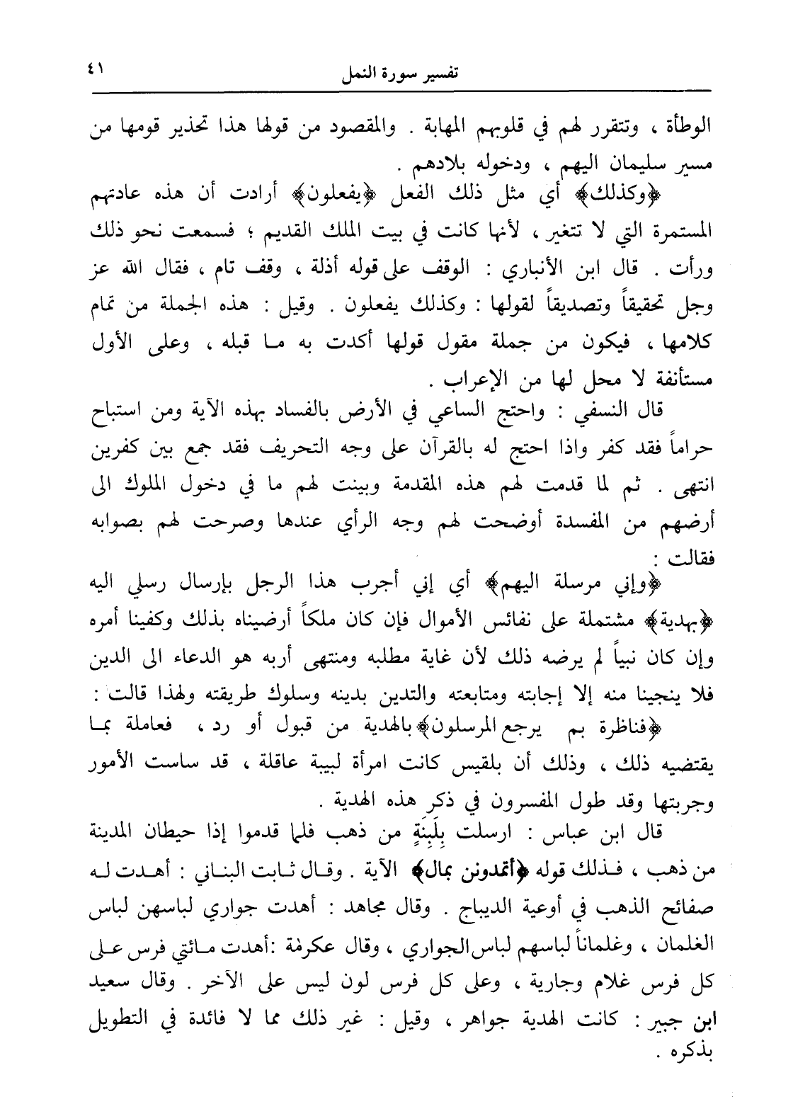 (فناظرة بم يرجع المرسلون) بالهدية من قبول أو رد، فعاملة بما يقتضيه ذلك، وذلك أن بلقيس كانت امرأة لبيبة عاقلة، قد ساست الأمور وجربتها وقد طول المفسرون في ذكر هذه الهدية.