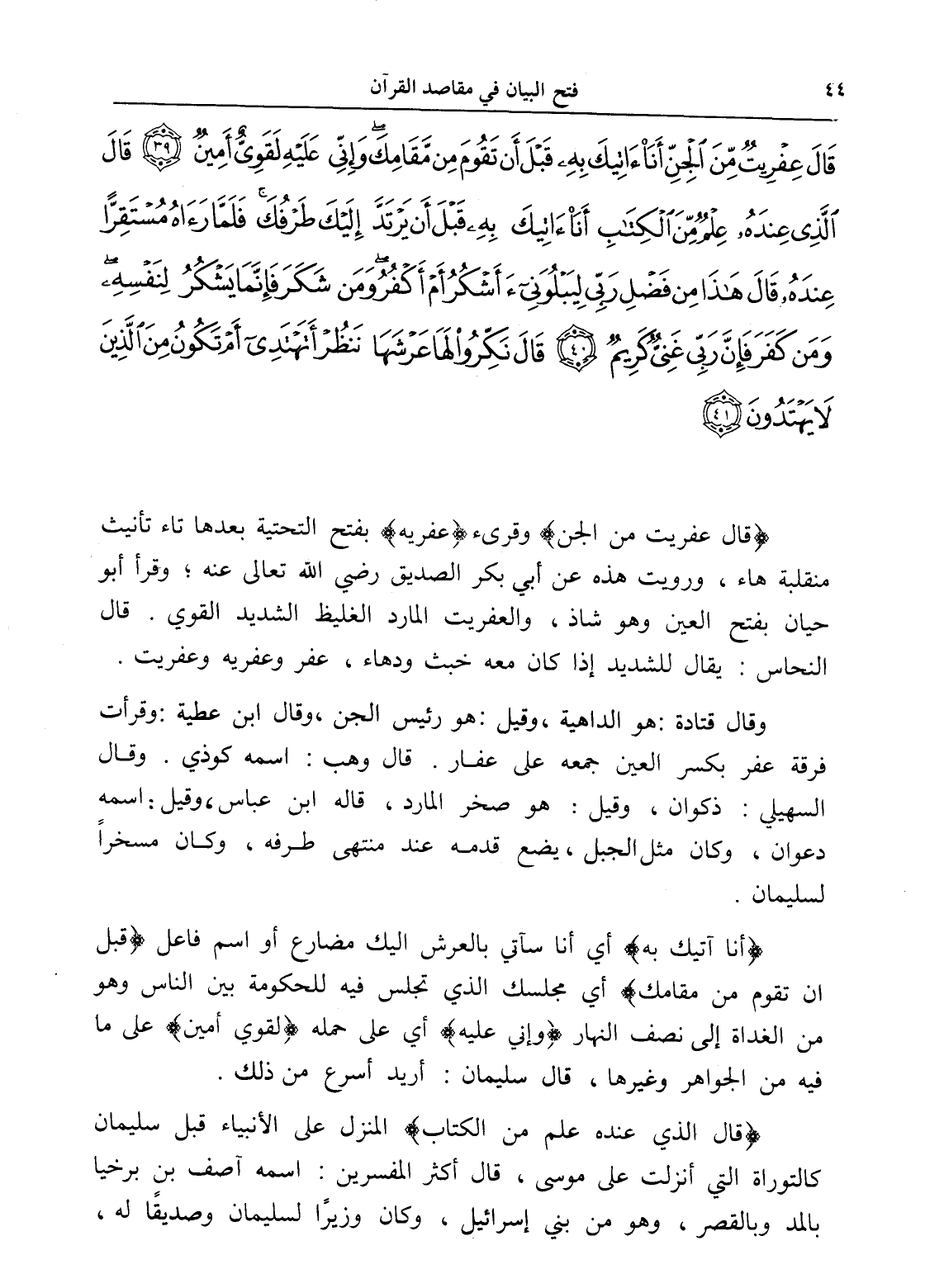 قَالَ عِفْرِيتٌ مِنَ الْجِنِّ أَنَا آتِيكَ بِهِ قَبْلَ أَنْ تَقُومَ مِنْ مَقَامِكَ وَإِنِّي عَلَيْهِ لَقَوِيٌّ أَمِينٌ (39) قَالَ الَّذِي عِنْدَهُ عِلْمٌ مِنَ الْكِتَابِ أَنَا آتِيكَ بِهِ قَبْلَ أَنْ يَرْتَدَّ إِلَيْكَ طَرْفُكَ فَلَمَّا رَآهُ مُسْتَقِرًّا عِنْدَهُ قَالَ هَذَا مِنْ فَضْلِ رَبِّي لِيَبْلُوَنِي أَأَشْكُرُ أَمْ أَكْفُرُ وَمَنْ شَكَرَ فَإِنَّمَا يَشْكُرُ لِنَفْسِهِ وَمَنْ كَفَرَ فَإِنَّ رَبِّي غَنِيٌّ كَرِيمٌ (40) قَالَ نَكِّرُوا لَهَا عَرْشَهَا نَنْظُرْ أَتَهْتَدِي أَمْ تَكُونُ مِنَ الَّذِينَ لَا يَهْتَدُونَ (41)