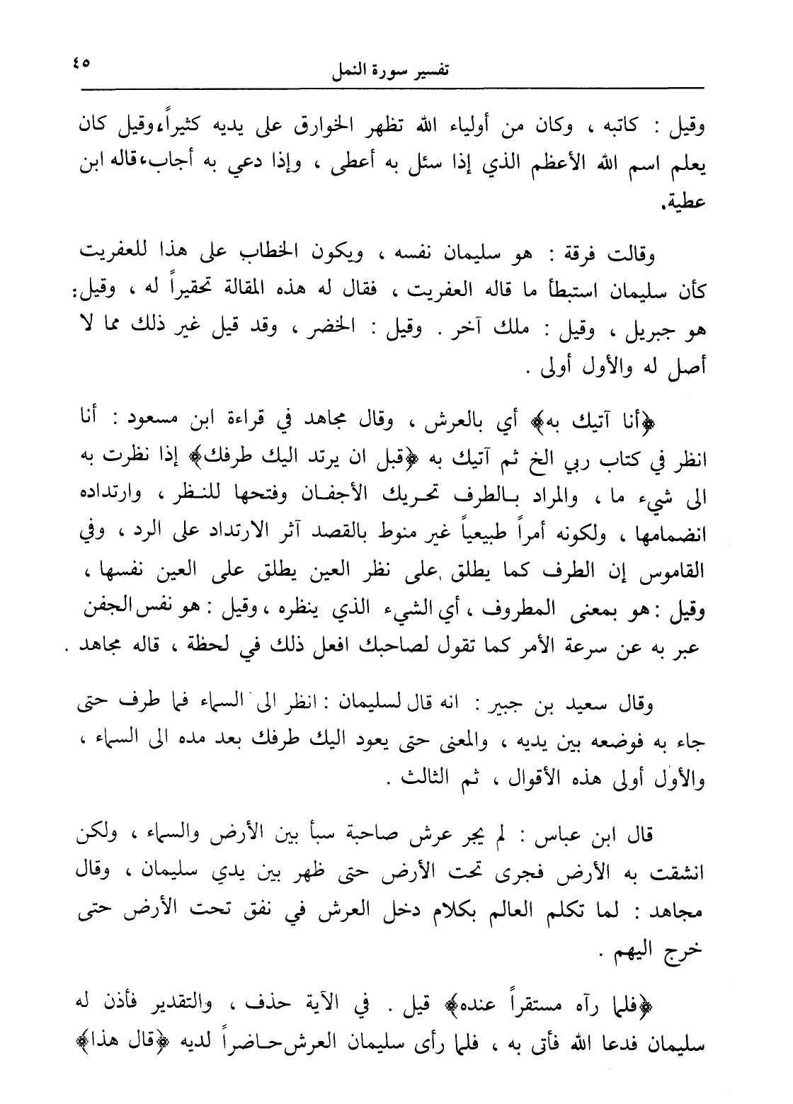 قال ابن عباس: لم يجر عرش صاحبة سبأ بين الأرض والسماء، ولكن انشقت به الأرض فجرى تحت الأرض حتى ظهر بين يدي سليمان، وقال مجاهد: لما تكلم العالم بكلام دخل العرش في نفق تحت الأرض حتى خرج إليهم.