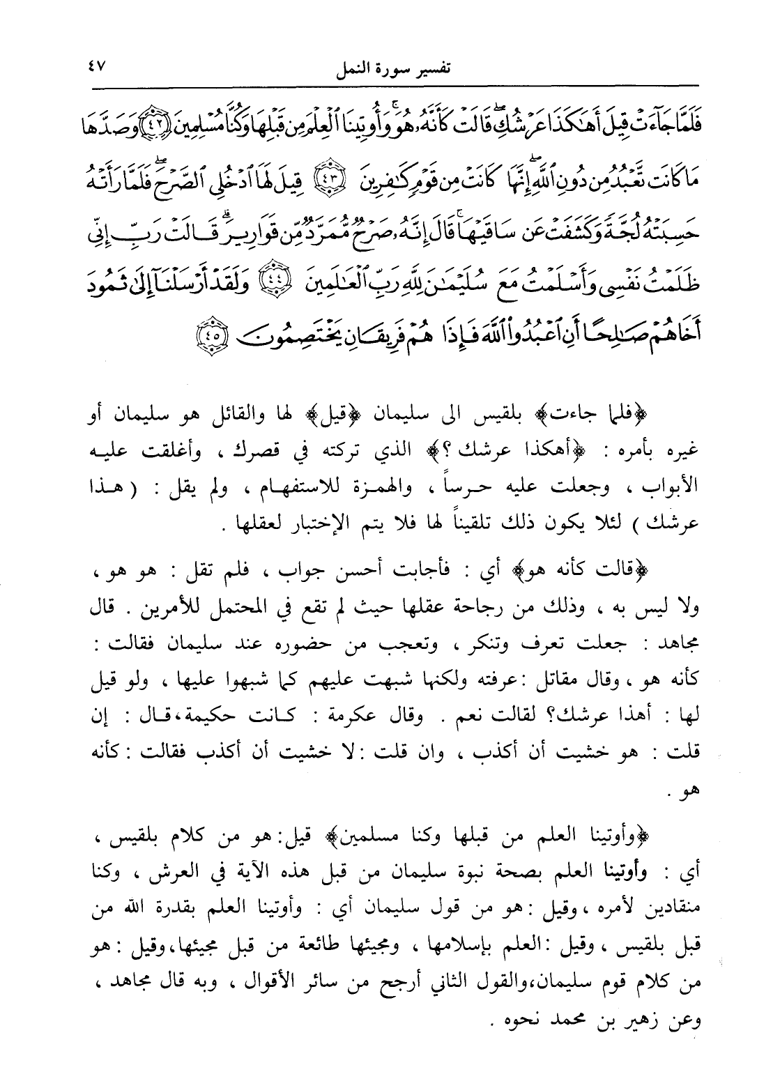 فَلَمَّا جَاءَتْ قِيلَ أَهَكَذَا عَرْشُكِ قَالَتْ كَأَنَّهُ هُوَ وَأُوتِينَا الْعِلْمَ مِنْ قَبْلِهَا وَكُنَّا مُسْلِمِينَ (42) وَصَدَّهَا مَا كَانَتْ تَعْبُدُ مِنْ دُونِ اللَّهِ إِنَّهَا كَانَتْ مِنْ قَوْمٍ كَافِرِينَ (43) قِيلَ لَهَا ادْخُلِي الصَّرْحَ فَلَمَّا رَأَتْهُ حَسِبَتْهُ لُجَّةً وَكَشَفَتْ عَنْ سَاقَيْهَا قَالَ إِنَّهُ صَرْحٌ مُمَرَّدٌ مِنْ قَوَارِيرَ قَالَتْ رَبِّ إِنِّي ظَلَمْتُ نَفْسِي وَأَسْلَمْتُ مَعَ سُلَيْمَانَ لِلَّهِ رَبِّ الْعَالَمِينَ (44) وَلَقَدْ أَرْسَلْنَا إِلَى ثَمُودَ أَخَاهُمْ صَالِحًا أَنِ اعْبُدُوا اللَّهَ فَإِذَا هُمْ فَرِيقَانِ يَخْتَصِمُونَ (45)