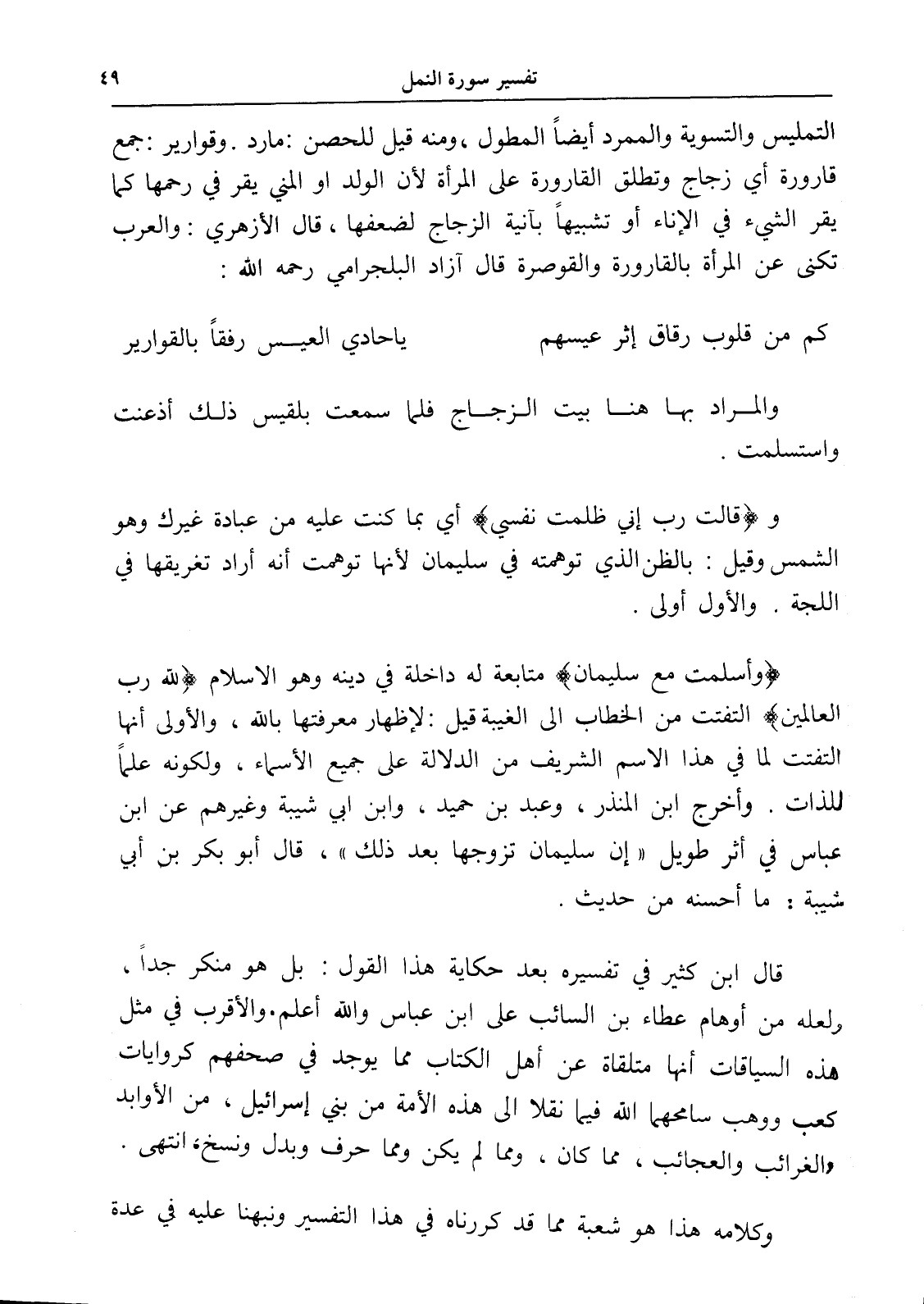 التمليس والتسوية والممرد أيضاً المطول، ومنه قيل للحصن: مارد. وقوارير: جمع قارورة أي زجاج وتطلق القارورة على المرأة لأن الولد أو المني يقر في رحمها كما يقر الشيء في الإناء أو تشبيهاً بآنية الزجاج لضعفها، قال الأزهري: والعرب تكنى عن المرأة بالقارورة والقوصرة قال آزاد البلجرامي رحمه الله: