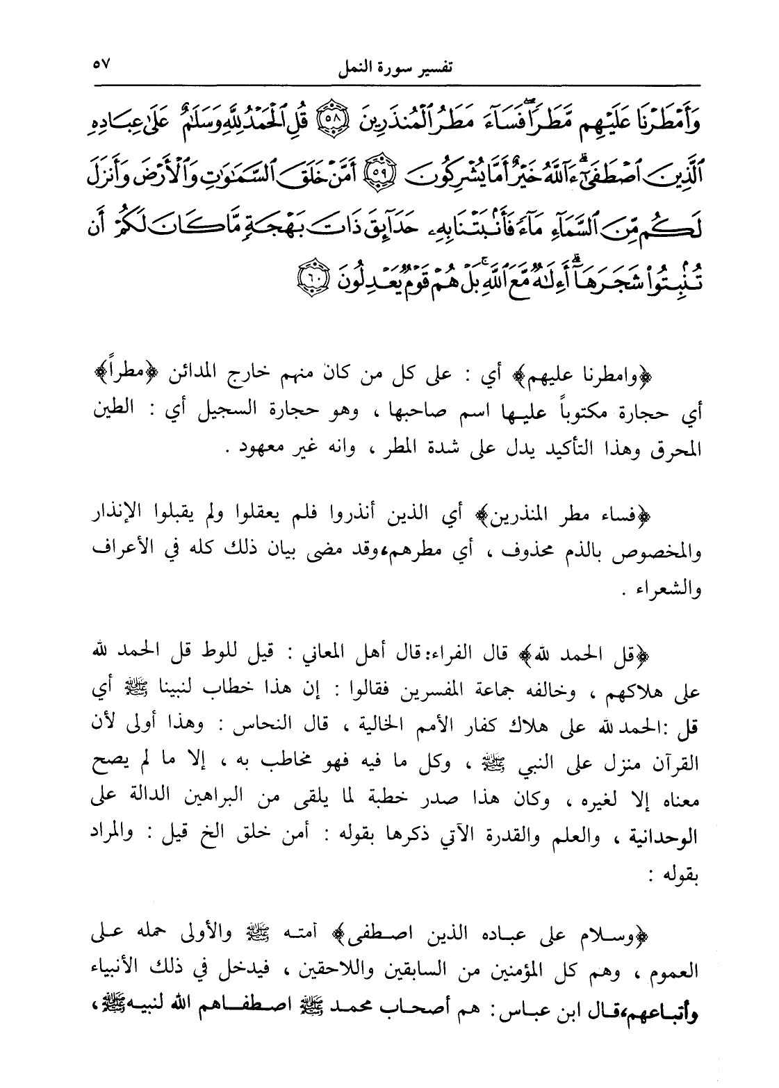 وَأَمْطَرْنَا عَلَيْهِمْ مَطَرًا فَسَاءَ مَطَرُ الْمُنْذَرِينَ (58) قُلِ الْحَمْدُ لِلَّهِ وَسَلَامٌ عَلَى عِبَادِهِ الَّذِينَ اصْطَفَى آللَّهُ خَيْرٌ أَمَّا يُشْرِكُونَ (59) أَمَّنْ خَلَقَ السَّمَاوَاتِ وَالْأَرْضَ وَأَنْزَلَ لَكُمْ مِنَ السَّمَاءِ مَاءً فَأَنْبَتْنَا بِهِ حَدَائِقَ ذَاتَ بَهْجَةٍ مَا كَانَ لَكُمْ أَنْ تُنْبِتُوا شَجَرَهَا أَإِلَهٌ مَعَ اللَّهِ بَلْ هُمْ قَوْمٌ يَعْدِلُونَ (60)