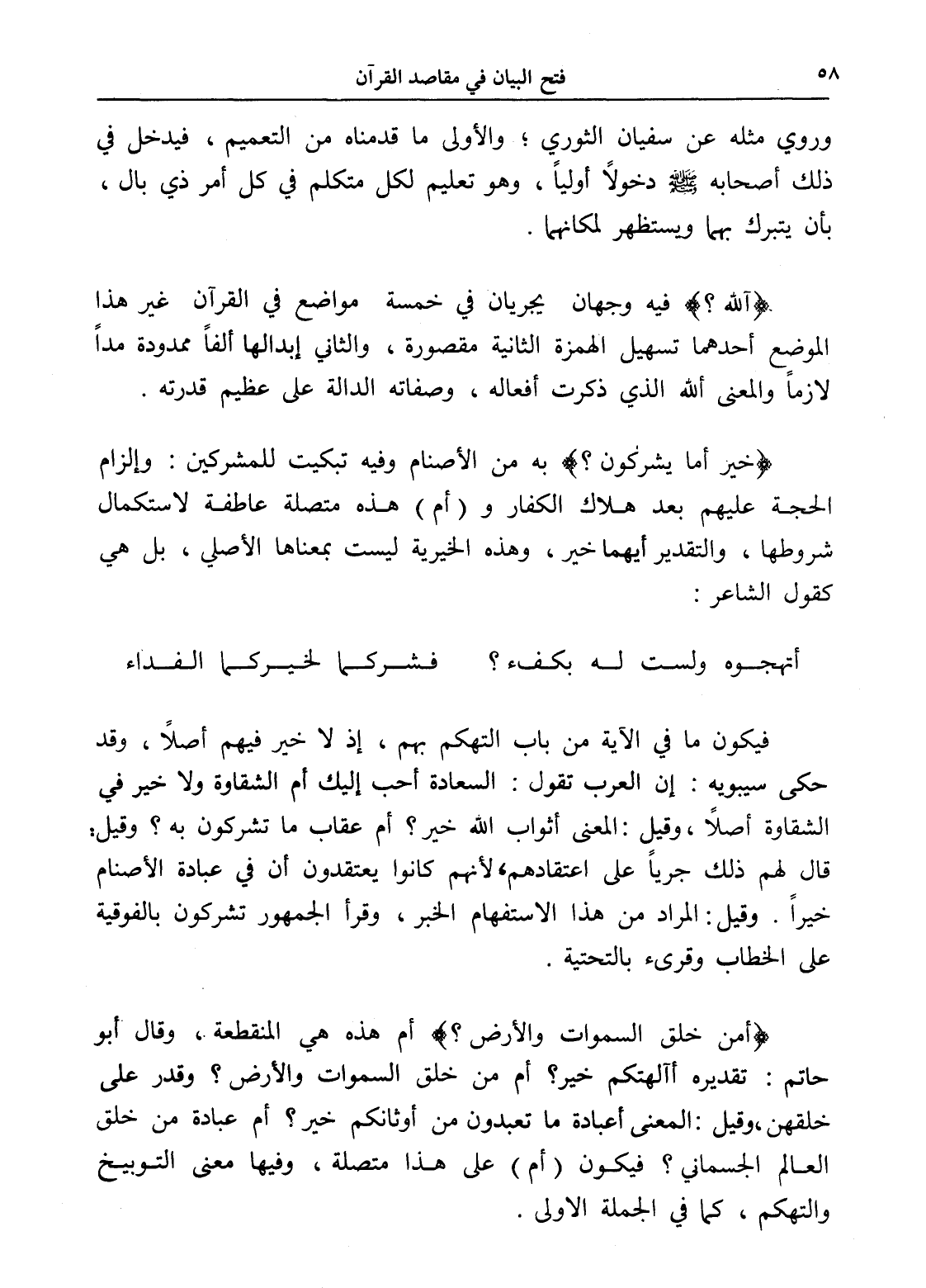فيكون ما في الآية من باب التهكم بهم، إذ لا خير فيهم أصلاً، وقد حكى سيبويه: إن العرب تقول: السعادة أحب إليك أم الشقاوة ولا خير في الشقاوة أصلاً، وقيل: المعنى أثواب الله خير؟ أم عقاب ما تشركون به؟ وقيل: قال لهم ذلك جرياً على اعتقادهم، لأنهم كانوا يعتقدون أن في عبادة الأصنام خيراً. وقيل: المراد من هذا الاستفهام الخبر، وقرأ الجمهور تشركون بالفوقية على الخطاب وقرئ بالتحتية.