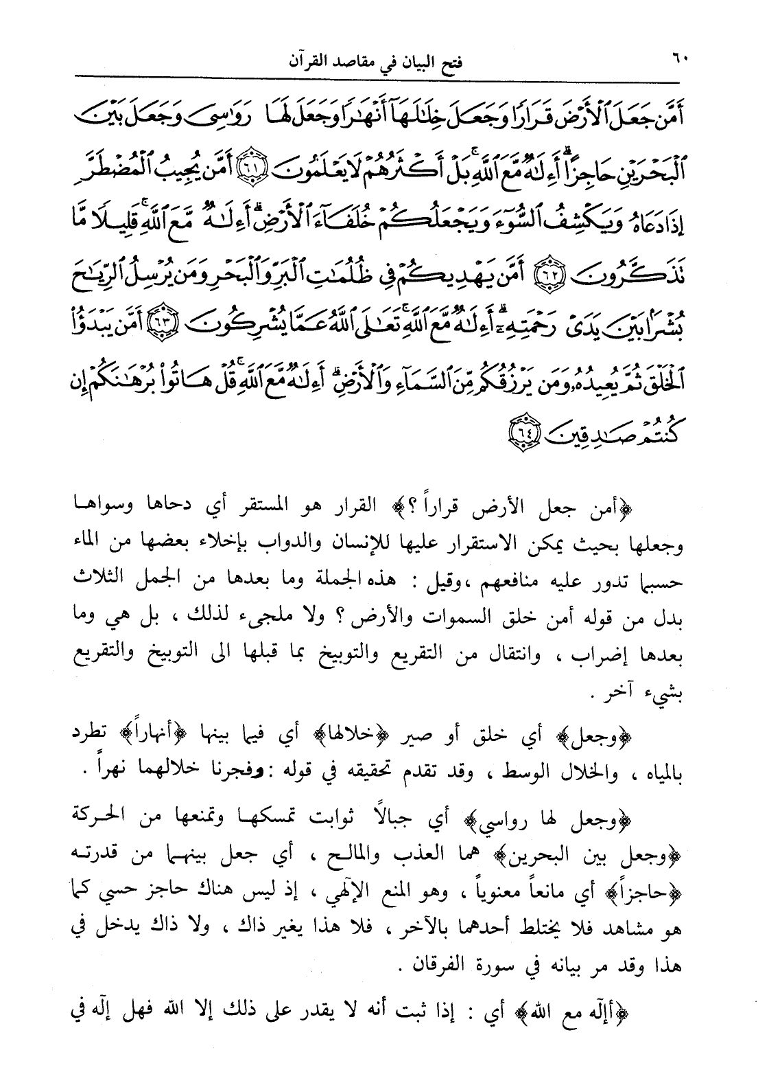 أَمَّنْ جَعَلَ الْأَرْضَ قَرَارًا وَجَعَلَ خِلَالَهَا أَنْهَارًا وَجَعَلَ لَهَا رَوَاسِيَ وَجَعَلَ بَيْنَ الْبَحْرَيْنِ حَاجِزًا أَإِلَهٌ مَعَ اللَّهِ بَلْ أَكْثَرُهُمْ لَا يَعْلَمُونَ (61) أَمَّنْ يُجِيبُ الْمُضْطَرَّ إِذَا دَعَاهُ وَيَكْشِفُ السُّوءَ وَيَجْعَلُكُمْ خُلَفَاءَ الْأَرْضِ أَإِلَهٌ مَعَ اللَّهِ قَلِيلًا مَا تَذَكَّرُونَ (62) أَمَّنْ يَهْدِيكُمْ فِي ظُلُمَاتِ الْبَرِّ وَالْبَحْرِ وَمَنْ يُرْسِلُ الرِّيَاحَ بُشْرًا بَيْنَ يَدَيْ رَحْمَتِهِ أَإِلَهٌ مَعَ اللَّهِ تَعَالَى اللَّهُ عَمَّا يُشْرِكُونَ (63) أَمَّنْ يَبْدَأُ الْخَلْقَ ثُمَّ يُعِيدُهُ وَمَنْ يَرْزُقُكُمْ مِنَ السَّمَاءِ وَالْأَرْضِ أَإِلَهٌ مَعَ اللَّهِ قُلْ هَاتُوا بُرْهَانَكُمْ إِنْ كُنْتُمْ صَادِقِينَ (64)