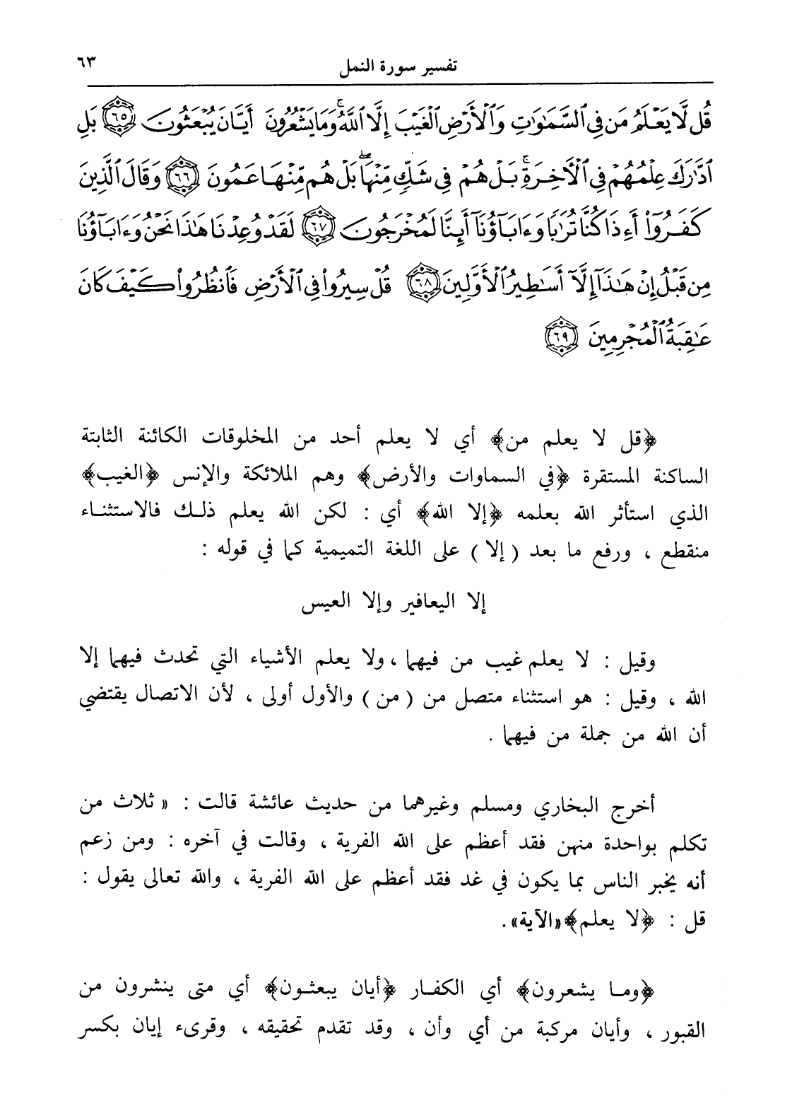 قُلْ لَا يَعْلَمُ مَنْ فِي السَّمَاوَاتِ وَالْأَرْضِ الْغَيْبَ إِلَّا اللَّهُ وَمَا يَشْعُرُونَ أَيَّانَ يُبْعَثُونَ (65) بَلِ ادَّارَكَ عِلْمُهُمْ فِي الْآخِرَةِ بَلْ هُمْ فِي شَكٍّ مِنْهَا بَلْ هُمْ مِنْهَا عَمُونَ (66) وَقَالَ الَّذِينَ كَفَرُوا أَإِذَا كُنَّا تُرَابًا وَآبَاؤُنَا أَئِنَّا لَمُخْرَجُونَ (67) لَقَدْ وُعِدْنَا هَذَا نَحْنُ وَآبَاؤُنَا مِنْ قَبْلُ إِنْ هَذَا إِلَّا أَسَاطِيرُ الْأَوَّلِينَ (68) قُلْ سِيرُوا فِي الْأَرْضِ فَانْظُرُوا كَيْفَ كَانَ عَاقِبَةُ الْمُجْرِمِينَ (69)