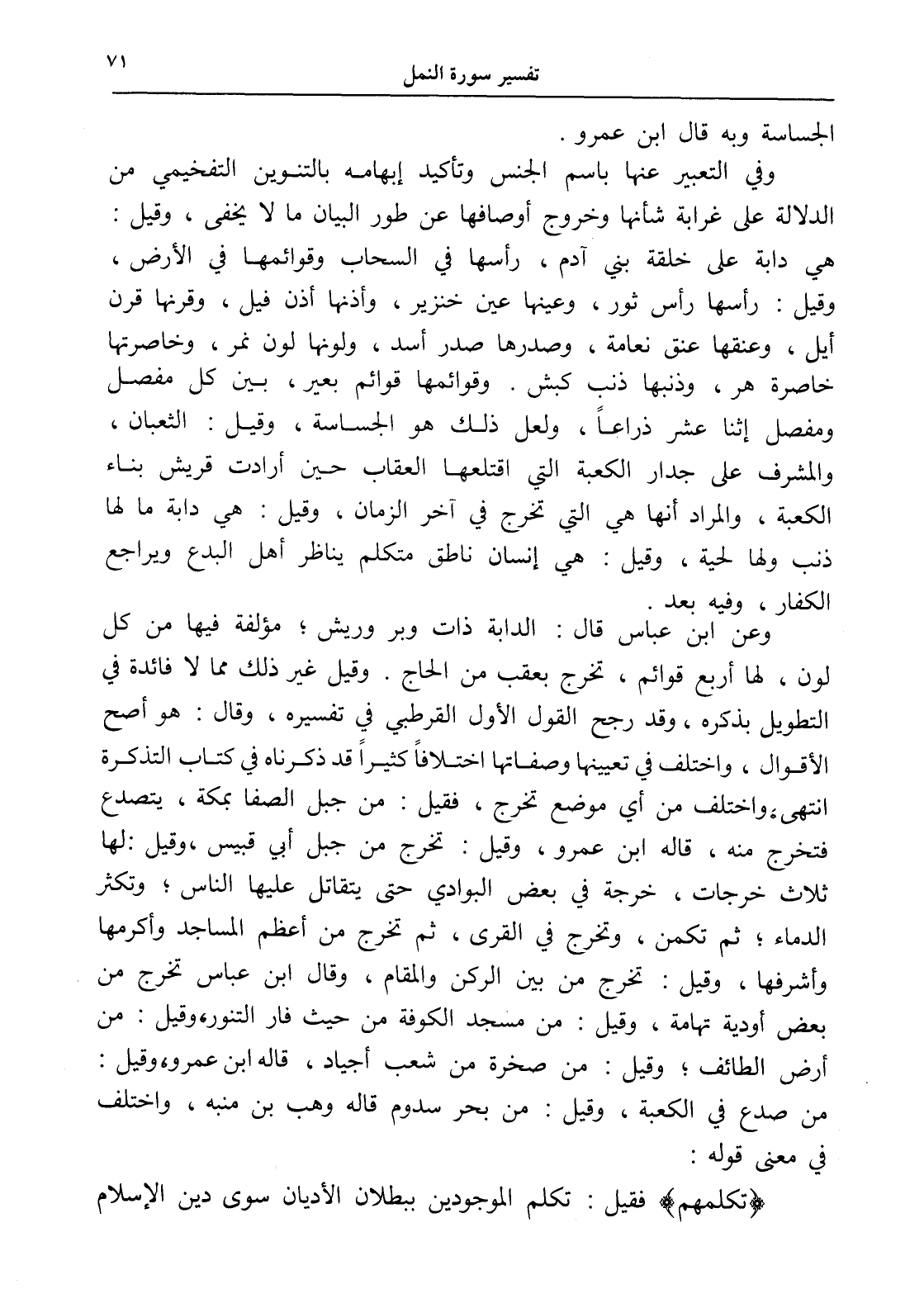 وعن ابن عباس قال: الدابة ذات وبر وريش؛ مؤلفة فيها من كل لون، لها أربع قوائم، تخرج بعقب من الحاج. وقيل غير ذلك مما لا فائدة في التطويل بذكره، وقد رجح القول الأول القرطبي في تفسيره، وقال: هو أصح الأقوال، واختلف في تعيينها وصفاتها اختلافاً كثيراً قد ذكرناه في كتاب التذكرة انتهى، واختلف من أي موضع تخرج، فقيل: من جبل الصفا بمكة، يتصدع فتخرج منه، قاله ابن عمرو، وقيل: تخرج من جبل أبي قبيس، وقيل: لها ثلاث خرجات، خرجة في بعض البوادي حتى يتقاتل عليها الناس؛ وتكثر الدماء؛ ثم تكمن، وتخرج في القرى، ثم تخرج من أعظم المساجد وأكرمها وأشرفها، وقيل: تخرج من بين الركن والمقام، وقال ابن عباس تخرج من بعض أودية تهامة، وقيل: من مسجد الكوفة من حيث فار التنور، وقيل: من أرض الطائف؛ وقيل: من صخرة من شعب أجياد، قاله ابن عمرو، وقيل: من صدع في الكعبة، وقيل: من بحر سدوم قاله وهب بن منبه، واختلف في معنى قوله:
