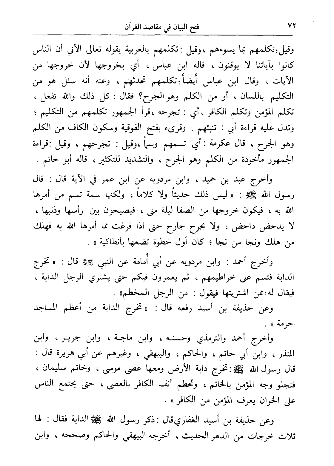 وأخرج أحمد والترمذي وحسنه، وابن ماجة، وابن جرير، وابن المنذر، وابن أبي حاتم، والحاكم، والبيهقي، وغيرهم عن أبي هريرة قال: قال رسول الله - صلى الله عليه وسلم -: " تخرج دابة الأرض ومعها عصى موسى، وخاتم سليمان، فتجلو وجه المؤمن بالخاتم، وتحطم أنف الكافر بالعصى، حتى يجتمع الناس على الخوان يعرف المؤمن من الكافر ".