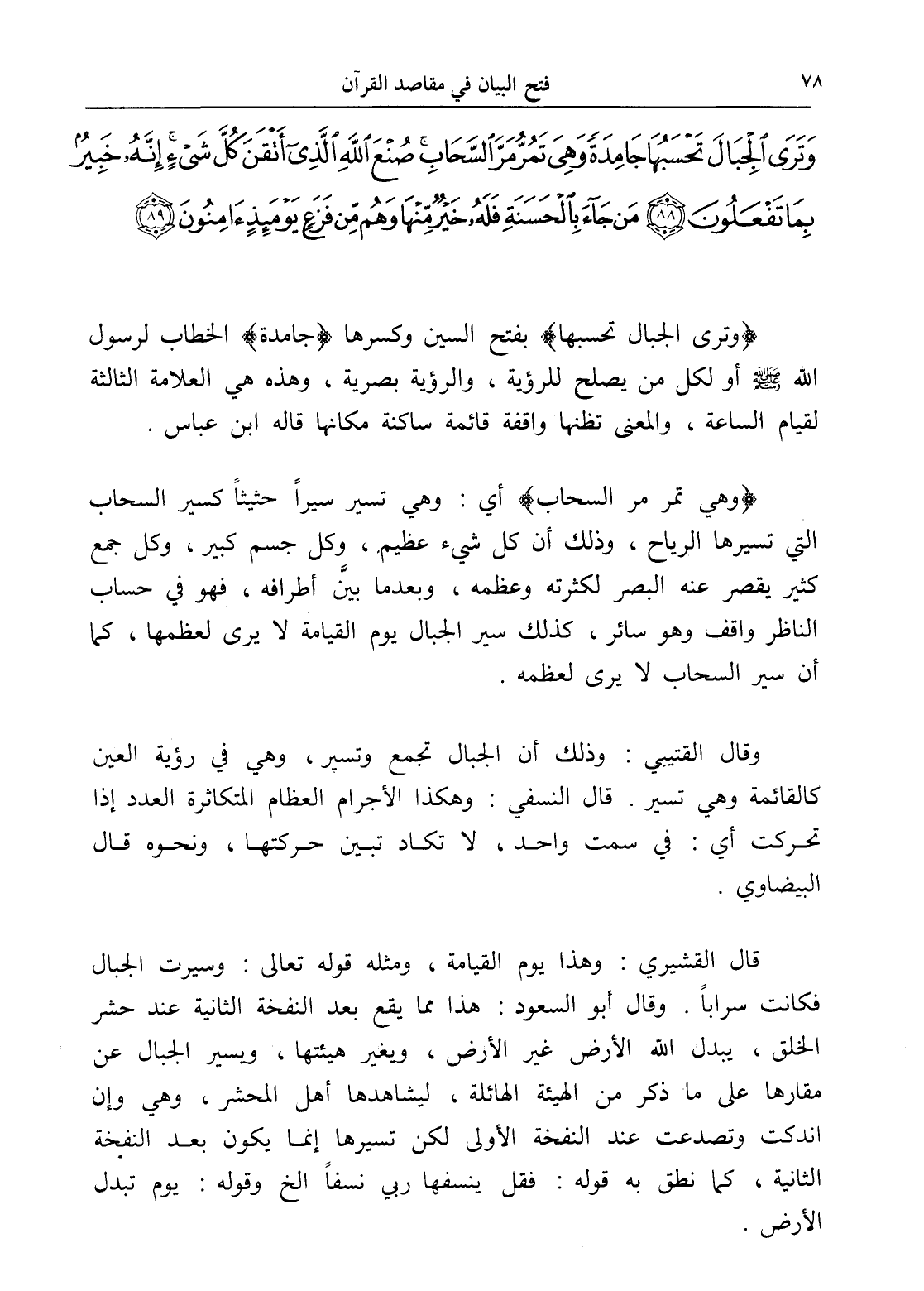 (وترى الجبال تحسبها) بفتح السين وكسرها (جامدة) الخطاب لرسول الله - صلى الله عليه وسلم - أو لكل من يصلح للرؤية، والرؤية بصرية، وهذه هي العلامة الثالثة لقيام الساعة، والمعنى تظنها واقفة قائمة ساكنة مكانها قاله ابن عباس.