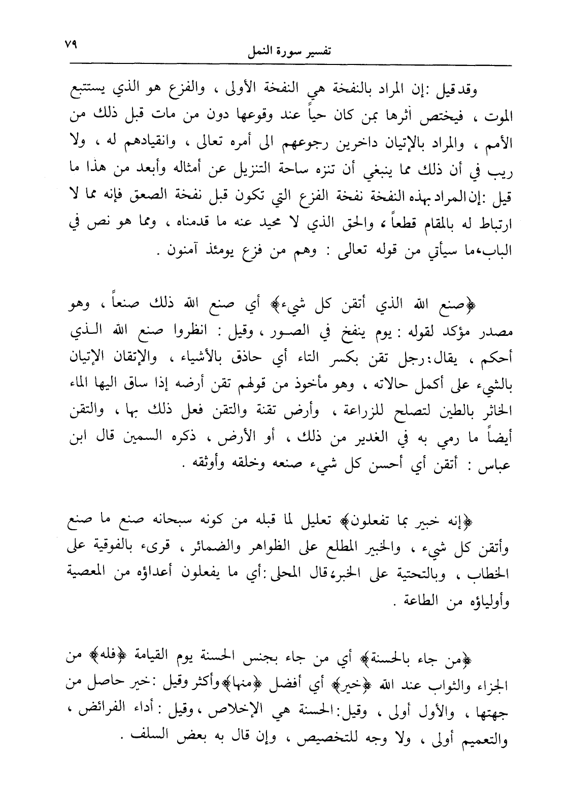 (صنع الله الذي أتقن كل شيء) أي صنع الله ذلك صنعاً، وهو مصدر مؤكد لقوله: يوم ينفخ في الصور، وقيل: انظروا صنع الله الذي أحكم، يقال: رجل تقن بكسر التاء أي حاذق بالأشياء، والإتقان الإتيان بالشيء على أكمل حالاته، وهو مأخوذ من قولهم تقن أرضه إذا ساق إليها الماء الخاثر بالطين لتصلح للزراعة، وأرض تقنة والتقن فعل ذلك بها، والتقن أيضاً ما رمي به في الغدير من ذلك، أو الأرض، ذكره السمين قال ابن عباس: أتقن أي أحسن كل شيء صنعه وخلقه وأوثقه.