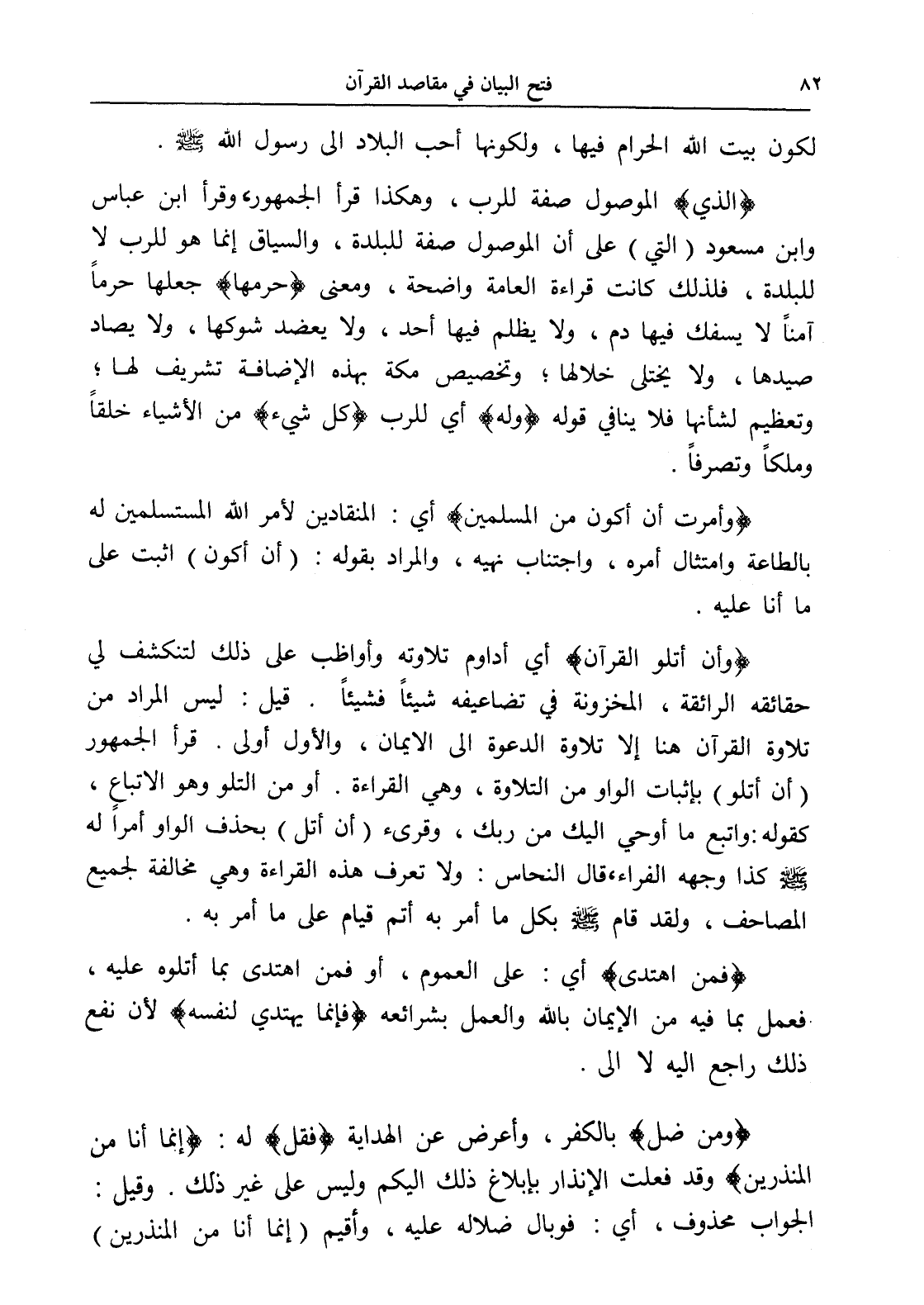 (الذي) الموصول صفة للرب، وهكذا قرأ الجمهور، وقرأ ابن عباس وابن مسعود (التي) على أن الموصول صفة للبلدة، والسياق إنما هو للرب لا للبلدة، فلذلك كانت قراءة العامة واضحة، ومعنى (حرمها) جعلها حرماً آمناً لا يسفك فيها دم، ولا يظلم فيها أحد، ولا يعضد شوكها، ولا يصاد صيدها، ولا يختلى خلالها؛ وتخصيص مكة بهذه الإضافة تشريف لها؛ وتعظيم لشأنها فلا ينافي قوله (وله) أي للرب (كل شيء) من الأشياء خلقاً وملكاً وتصرفاً.