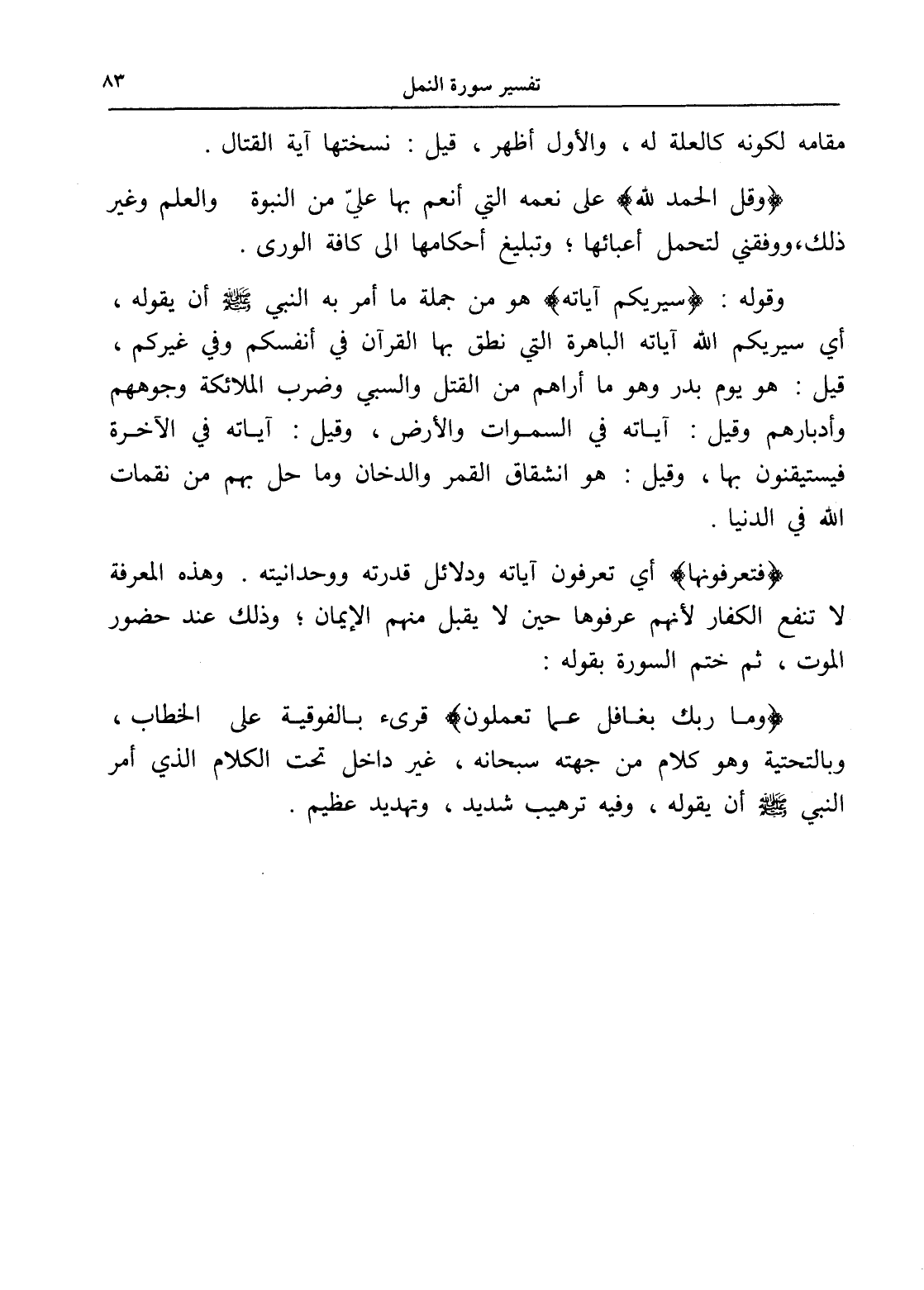 (فتعرفونها) أي تعرفون آياته ودلائل قدرته ووحدانيته. وهذه المعرفة لا تنفع الكفار لأنهم عرفوها حين لا يقبل منهم الإيمان؛ وذلك عند حضور الموت، ثم ختم السورة بقوله: