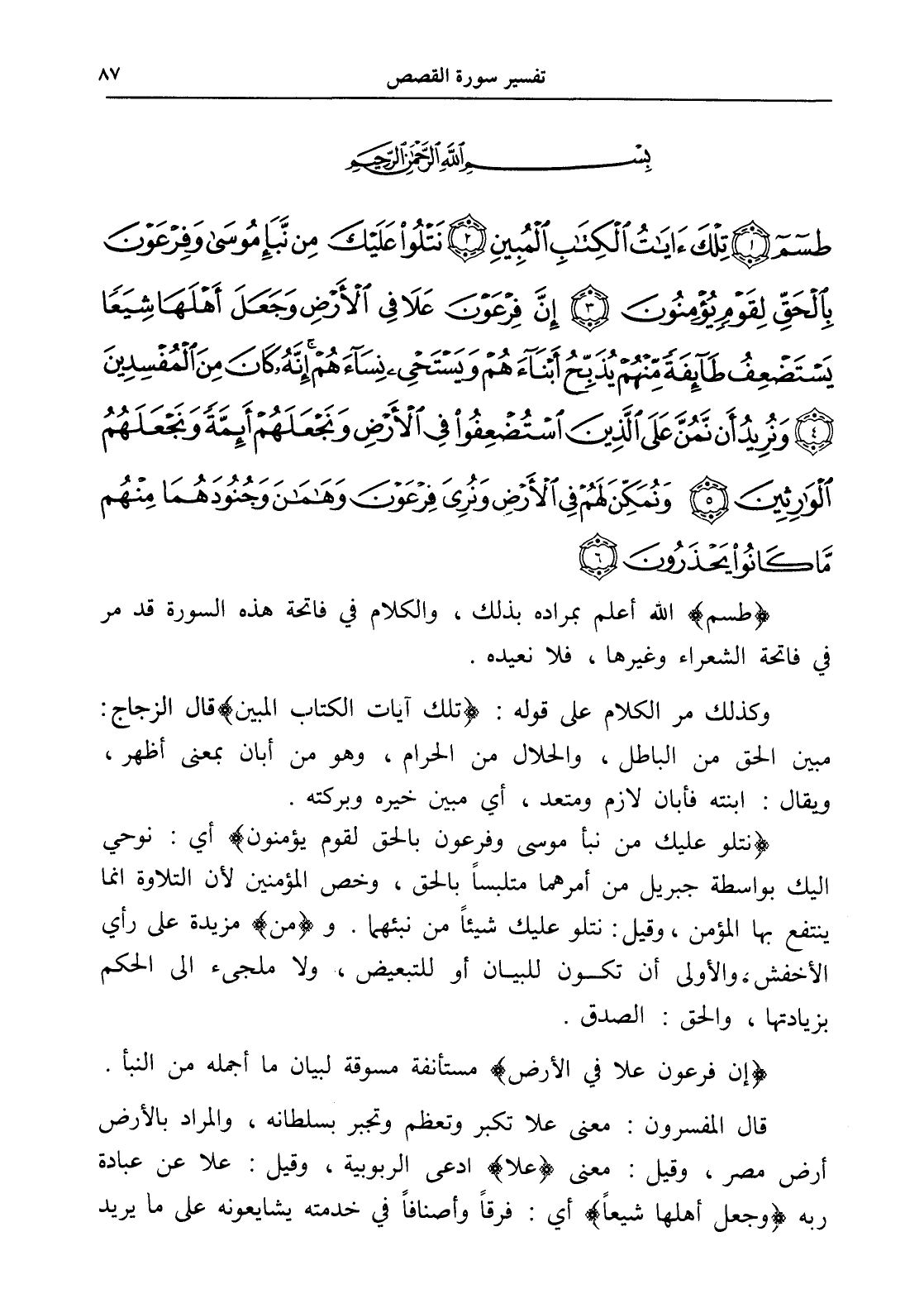 طسم (1) تِلْكَ آيَاتُ الْكِتَابِ الْمُبِينِ (2) نَتْلُو عَلَيْكَ مِنْ نَبَإِ مُوسَى وَفِرْعَوْنَ بِالْحَقِّ لِقَوْمٍ يُؤْمِنُونَ (3) إِنَّ فِرْعَوْنَ عَلَا فِي الْأَرْضِ وَجَعَلَ أَهْلَهَا شِيَعًا يَسْتَضْعِفُ طَائِفَةً مِنْهُمْ يُذَبِّحُ أَبْنَاءَهُمْ وَيَسْتَحْيِي نِسَاءَهُمْ إِنَّهُ كَانَ مِنَ الْمُفْسِدِينَ (4) وَنُرِيدُ أَنْ نَمُنَّ عَلَى الَّذِينَ اسْتُضْعِفُوا فِي الْأَرْضِ وَنَجْعَلَهُمْ أَئِمَّةً وَنَجْعَلَهُمُ الْوَارِثِينَ (5) وَنُمَكِّنَ لَهُمْ فِي الْأَرْضِ وَنُرِيَ فِرْعَوْنَ وَهَامَانَ وَجُنُودَهُمَا مِنْهُمْ مَا كَانُوا يَحْذَرُونَ (6)