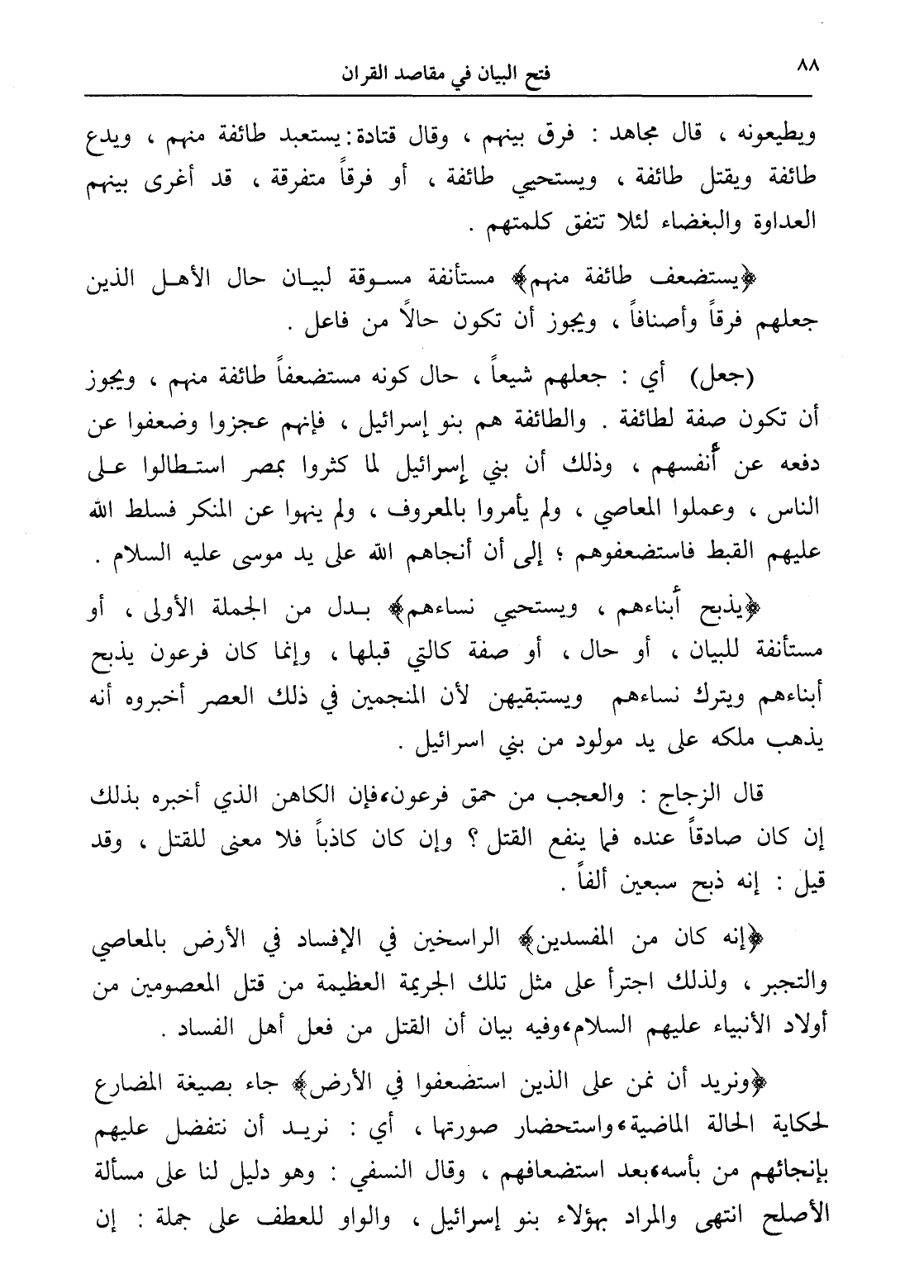 (يذبح أبناءهم ويستحيي نساءهم) بدل من الجملة الأولى، أو مستأنفة للبيان، أو حال، أو صفة كالتي قبلها، وإنما كان فرعون يذبح أبناءهم ويترك نساءهم ويستبقيهن لأن المنجمين في ذلك العصر أخبروه أنه يذهب ملكه على يد مولود من بني إسرائيل.