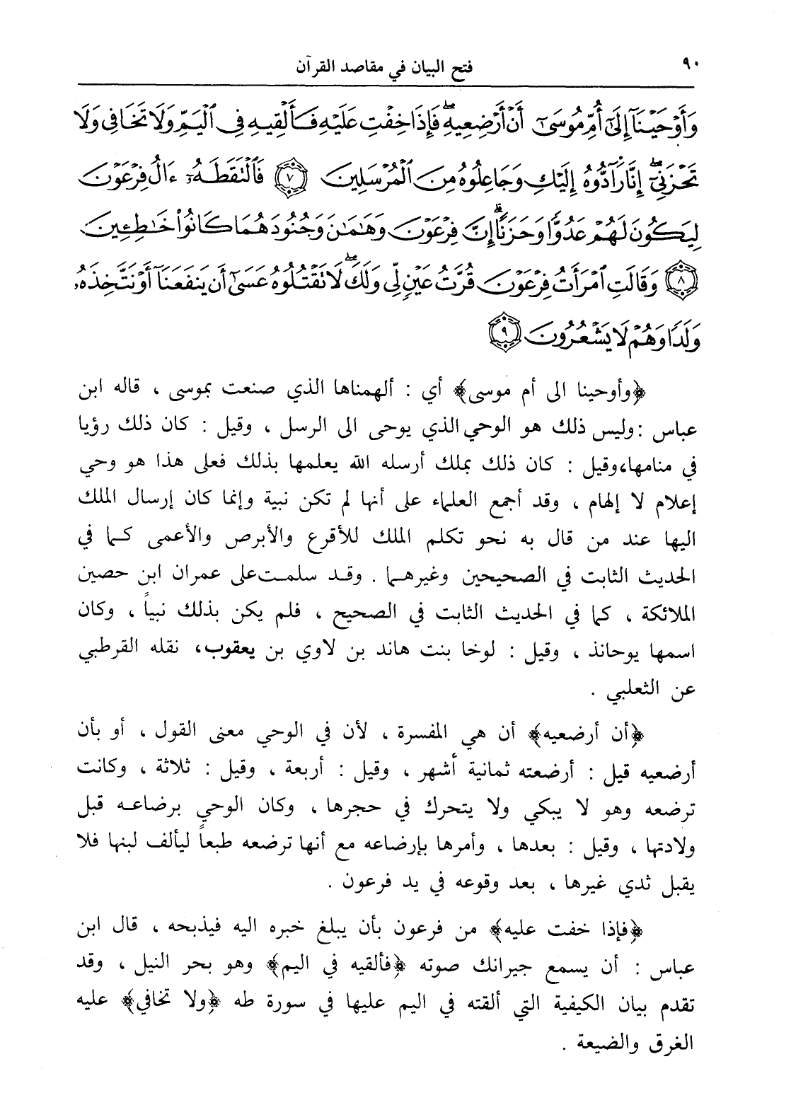وَأَوْحَيْنَا إِلَى أُمِّ مُوسَى أَنْ أَرْضِعِيهِ فَإِذَا خِفْتِ عَلَيْهِ فَأَلْقِيهِ فِي الْيَمِّ وَلَا تَخَافِي وَلَا تَحْزَنِي إِنَّا رَادُّوهُ إِلَيْكِ وَجَاعِلُوهُ مِنَ الْمُرْسَلِينَ (7) فَالْتَقَطَهُ آلُ فِرْعَوْنَ لِيَكُونَ لَهُمْ عَدُوًّا وَحَزَنًا إِنَّ فِرْعَوْنَ وَهَامَانَ وَجُنُودَهُمَا كَانُوا خَاطِئِينَ (8) وَقَالَتِ امْرَأَتُ فِرْعَوْنَ قُرَّتُ عَيْنٍ لِي وَلَكَ لَا تَقْتُلُوهُ عَسَى أَنْ يَنْفَعَنَا أَوْ نَتَّخِذَهُ وَلَدًا وَهُمْ لَا يَشْعُرُونَ (9)