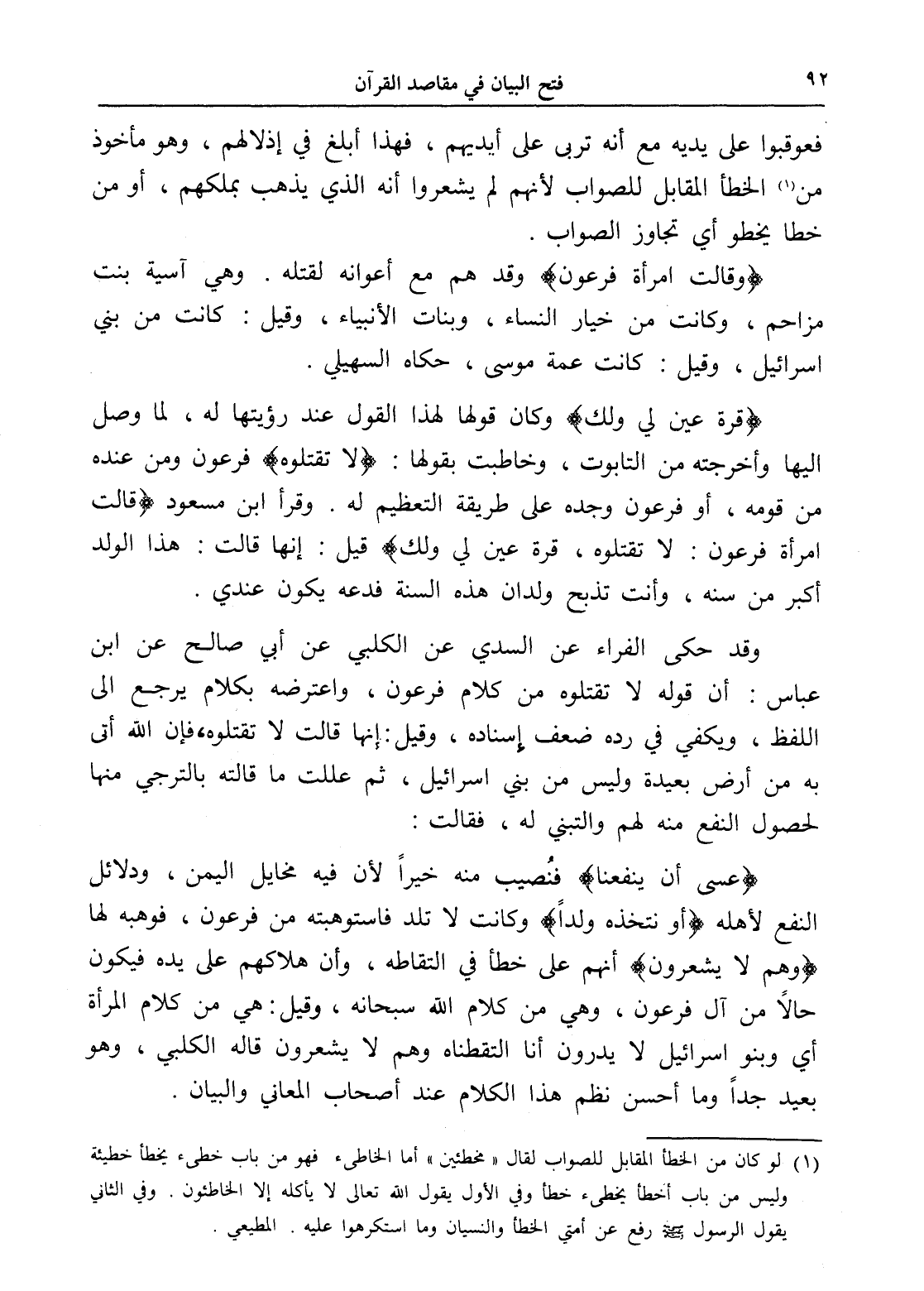 (قرة عين لي ولك) وكان قولها لهذا القول عند رؤيتها له، لما وصل إليها وأخرجته من التابوت، وخاطبت بقولها: (لا تقتلوه) فرعون ومن عنده من قومه، أو فرعون وجده على طريقة التعظيم له. وقرأ ابن مسعود (قالت امرأة فرعون لا تقتلوه قرة عين لي ولك) قيل: إنها قالت: هذا الولد أكبر من سنه، وأنت تذبح ولدان هذه السنة فدعه يكون عندي.