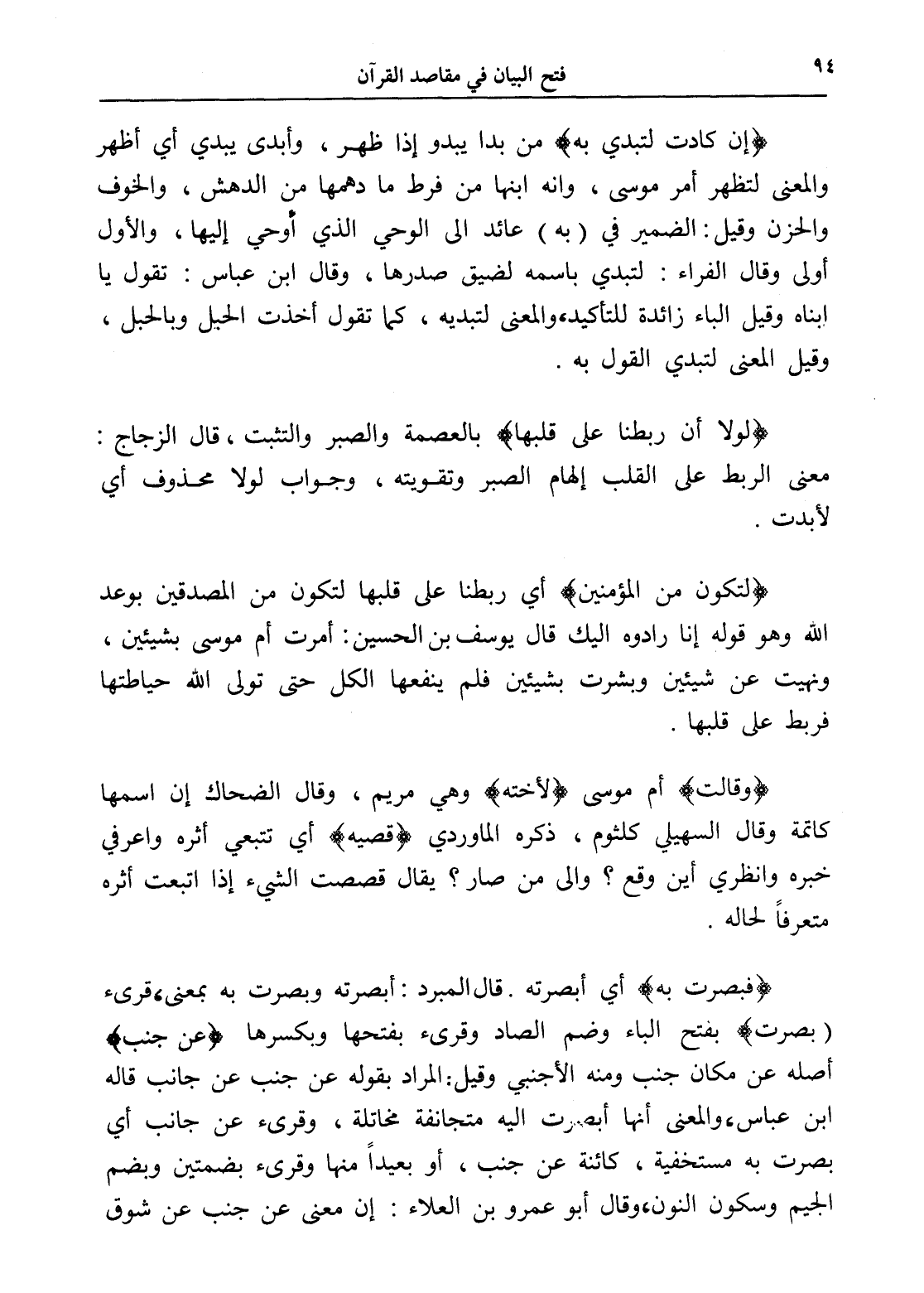(إن كادت لتبدي به) من بدا يبدو إذا ظهر، وأبدى يبدي أي أظهر والمعنى لتظهر أمر موسى، وأنه ابنها من فرط ما دهمها من الدهش، والخوف والحزن وقيل: الضمير في (به) عائد إلى الوحي الذي أوحي إليها، والأول أولى وقال الفراء: لتبدي باسمه لضيق صدرها، وقال ابن عباس: تقول يا ابناه وقيل الباء زائدة للتأكيد، والمعنى لتبديه، كما تقول أخذت الحيل وبالحبل، وقيل المعنى لتبدي القول به.