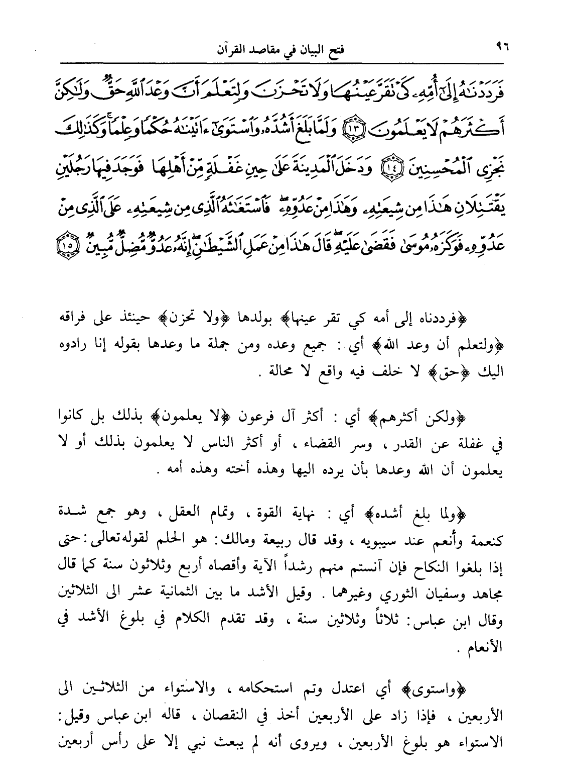 فَرَدَدْنَاهُ إِلَى أُمِّهِ كَيْ تَقَرَّ عَيْنُهَا وَلَا تَحْزَنَ وَلِتَعْلَمَ أَنَّ وَعْدَ اللَّهِ حَقٌّ وَلَكِنَّ أَكْثَرَهُمْ لَا يَعْلَمُونَ (13) وَلَمَّا بَلَغَ أَشُدَّهُ وَاسْتَوَى آتَيْنَاهُ حُكْمًا وَعِلْمًا وَكَذَلِكَ نَجْزِي الْمُحْسِنِينَ (14) وَدَخَلَ الْمَدِينَةَ عَلَى حِينِ غَفْلَةٍ مِنْ أَهْلِهَا فَوَجَدَ فِيهَا رَجُلَيْنِ يَقْتَتِلَانِ هَذَا مِنْ شِيعَتِهِ وَهَذَا مِنْ عَدُوِّهِ فَاسْتَغَاثَهُ الَّذِي مِنْ شِيعَتِهِ عَلَى الَّذِي مِنْ عَدُوِّهِ فَوَكَزَهُ مُوسَى فَقَضَى عَلَيْهِ قَالَ هَذَا مِنْ عَمَلِ الشَّيْطَانِ إِنَّهُ عَدُوٌّ مُضِلٌّ مُبِينٌ (15)