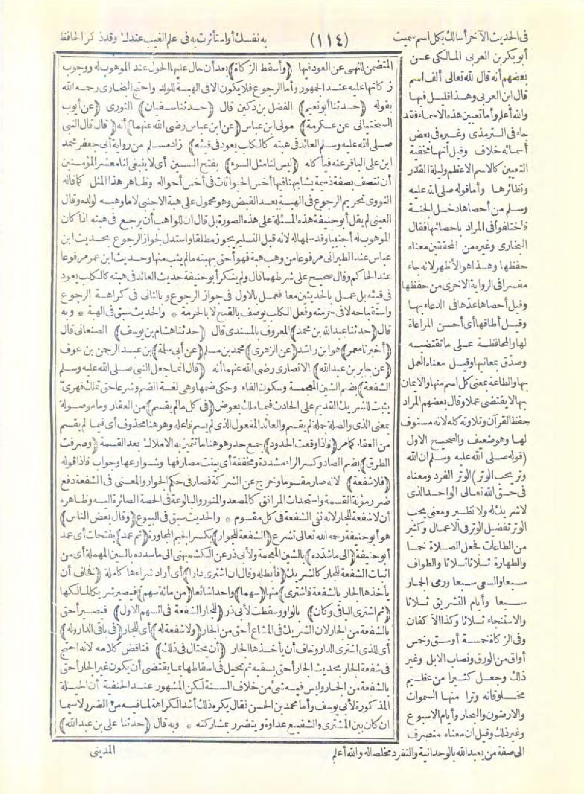 النبي -صَلَّى اللَّهُ عَلَيْهِ وَسَلَّمَ- الشفعة) بضم الشين المعجمة وسكون الفاء وحكي ضمها وهي لغة الضم وشرعًا حق تملك قهري يثبت للشريك القديم على الحادث فيما ملك بعوض (في كل ما لم يقسم) من العقار وما موصولة بمعنى الذي والصلة جملة لم يقسم والعائد المفعول الذي لم يسم فاعله وهو هنا محذوف أي فيما لم يقسم من العقار كما مر (فإذا وقعت الحدود) جمع حدّ وهو هنا ما تتميز به الأملاك بعد القسمة (وصرفت الطرق) بضم الصاد وكسر الراء مشدّدة ومخففة أي بينت مصارفها وشوارعها وجواب فإذا قوله: (فلا شفعة) لأنه صار مقسومًا وخرج عن الشركة فصار في حكم الجوار، والمعنى في الشفعة دفع ضرر مؤونة القسمة واستحداث المرافق المصعد والمنور والبالوعة في الحصة الصائرة إليه وظاهره أن لا شفعة للجار لأنه نفى الشفعة في كل مقسوم.