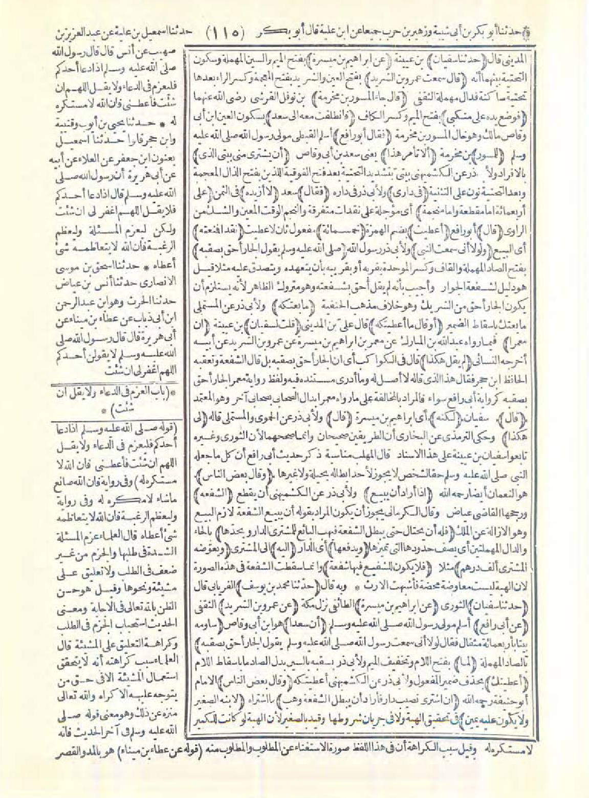 المديني قال: (حدّثنا سفيان) بن عيينة (عن إبراهيم بن ميسرة) بفتح الميم والسين المهملة وسكون التحتية بينهما أنه (قال: سمعت عمرو بن الشريد) بفتح العين والشريد بفتح المعجمة وكسر الراء بعدها تحتية ساكنة فدال مهملة الثقفي (قال: جاء المسور بن مخرمة) بن نوفل القرشي -رضي الله عنهما- (فوضع يده على منكبي) بفتح الميم وكسر الكاف (فانطلقت معه إلى سعد) بسكون العين ابن أبي وقاص مالك وهو خال المسور بن مخرمة (فقال أبو رافع) أسلم القبطي مولى رسول الله -صَلَّى اللَّهُ عَلَيْهِ وَسَلَّمَ- (للمسور) بن مخرمة (ألا تأمر هذا) يعني سعد بن أبي وقاص (أن يشتري مني بيتي الذي) بالإفراد ولأبي ذر عن الكشميهني بيتي بتشديد التحتية بعد فتح الفوقية اللذين بفتح الذال المعجمة وبعد التحتية نون على التثنية (في داري؟) ولأبي ذر في داره (فقال) سعد: (لا أزيده) في الثمن (على أربعمائة إما مقطعة وإما منجمة) أي مؤجلة على نقدات متفرقة والنجم الوقت المعين والشك من الراوي (قال) أبو رافع (أعطيت) بضم الهمزة (خمسمائة) مفعول ثان لأعطيت (نقدًا فمنعته) أي البيع (ولولا أني سمعت النبي) ولأبي ذر رسول الله -صَلَّى اللَّهُ عَلَيْهِ وَسَلَّمَ- (-صَلَّى اللَّهُ عَلَيْهِ وَسَلَّمَ- يقول):