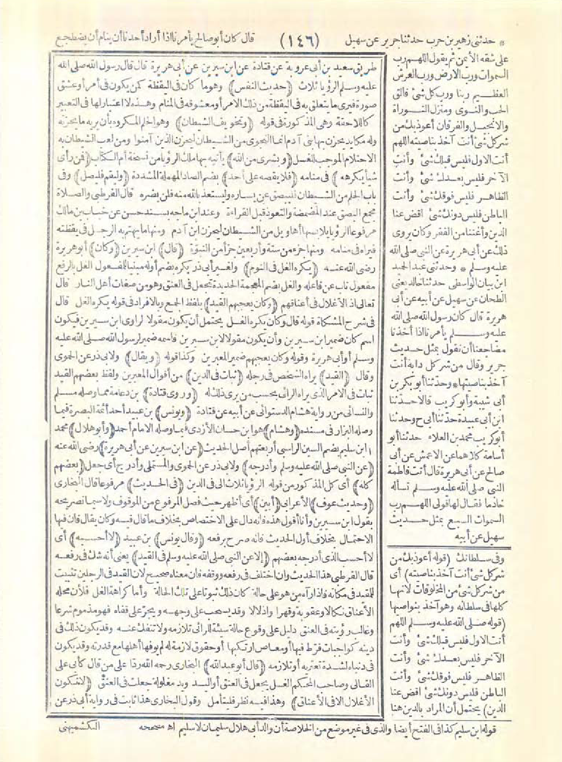 طريق سعيد بن أبي عروبة عن قتادة عن ابن سيرين عن أبي هريرة قال: قال رسول الله -صَلَّى اللَّهُ عَلَيْهِ وَسَلَّمَ- الرؤيا ثلاث (حديث النفس) وهو ما كان في اليقظة كمن يكون في أمر أو عشق صورة فيرى ما يتعلق به في اليقظة من ذلك الأمر أو معشوقه في المنام وهذه لا اعتبار لها في التعبير كاللاحقة وهي المذكورة في قوله: (وتخويف الشيطان) وهو الحلم المكروه بأن يريه ما يحزنه وله مكايد يحزن بها بني آدم إنما النجوى من الشيطان ليحزن الذين آمنوا ومن لعب الشيطان به الاحتلام الموجب للغسل (وبشرى من الله) يأتيه بها ملك الرؤيا من نسخة أم الكتاب (فمن رأى شيئًا يكرهه) في منامه (فلا يقصه على أحد) بضم الصاد المهملة المشددة (وليقم فليصل). وفي باب الحلم من الشيطان فليبصق عن يساره وليستعذ بالله منه فلن يضره. قال القرطبي: والصلاة مجمع البصق عند المضمضة والتعوذ قبل القراءة، وعند ابن ماجة بسند حسن عن خباب بن مالك مرفوعًا: الرؤيا يلابسها أهاويل من الشيطان ليحزن ابن آدم ومنها ما يهتم به الرجل في يقظته فيراه في منامه ومنها جزء من ستة وأربعين جزءًا من النبوّة.