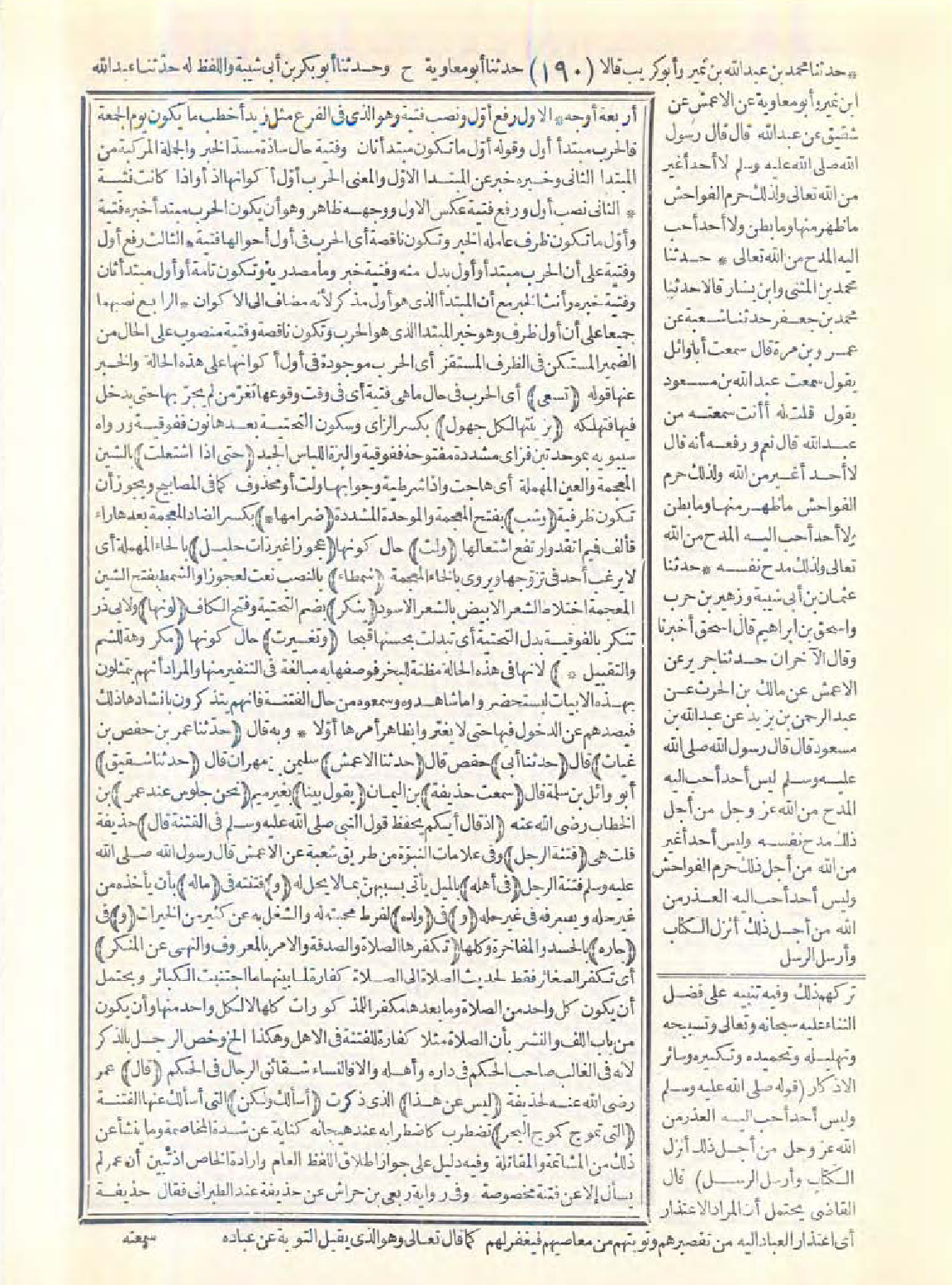 وبه قال: (حدّثنا عمر بن حفص بن غياث) قال: (حدّثنا أبي) حفص قال: (حدّثنا الأعمش) سليمان بن مهران قال: (حدّثنا شقيق) أبو وائل بن سلمة قال: (سمعت حذيفة) بن اليمان (يقول: بينا) بغير ميم (نحن جلوس عند عمر) بن الخطاب -رضي الله عنه- (إذا قال: أيكم يحفظ قول النبي -صَلَّى اللَّهُ عَلَيْهِ وَسَلَّمَ- في الفتنة؟ قال) حذيفة قلت هي (فتنة الرجل) وفي علامات النبوّة من طريق شعبة عن الأعمش قال رسول الله -صَلَّى اللَّهُ عَلَيْهِ وَسَلَّمَ-: فتنة الرجل (في أهله) بالميل يأتي بسببهنّ بما لا يحل له (و) فتنته في (ماله) بأن يأخذ من غير حله ويصرفه في غير حله (و) في (ولده) لفرط محبته له والشغل به عن كثير من الخيرات (و) في (جاره) بالحسد والمفاخرة وكلها (تكفرها الصلاة والصدقة والأمر بالمعروف والنهي عن المنكر) أي تكفر الصغائر فقط لحديث الصلاة إلى الصلاة كفّارة لما بينهما ما اجتنبت الكبائر، ويحتمل أن يكون كل واحد من الصلاة وما بعدها مكفرًا للمذكورات كلها لا لكل واحد منها، وأن يكون من باب اللف والنشر بأن الصلاة مثلاً كفّارة للفتنة في الأهل وهكذا الخ ... وخص الرجل بالذكر لأنه في الغالب صاحب الحكم في داره وأهله إلا فالنساء شقائق الرجال في الحكم (قال) عمر -رضي الله عنه- لحذيفة (ليس عن هذا) الذي ذكرت (أسألك،
