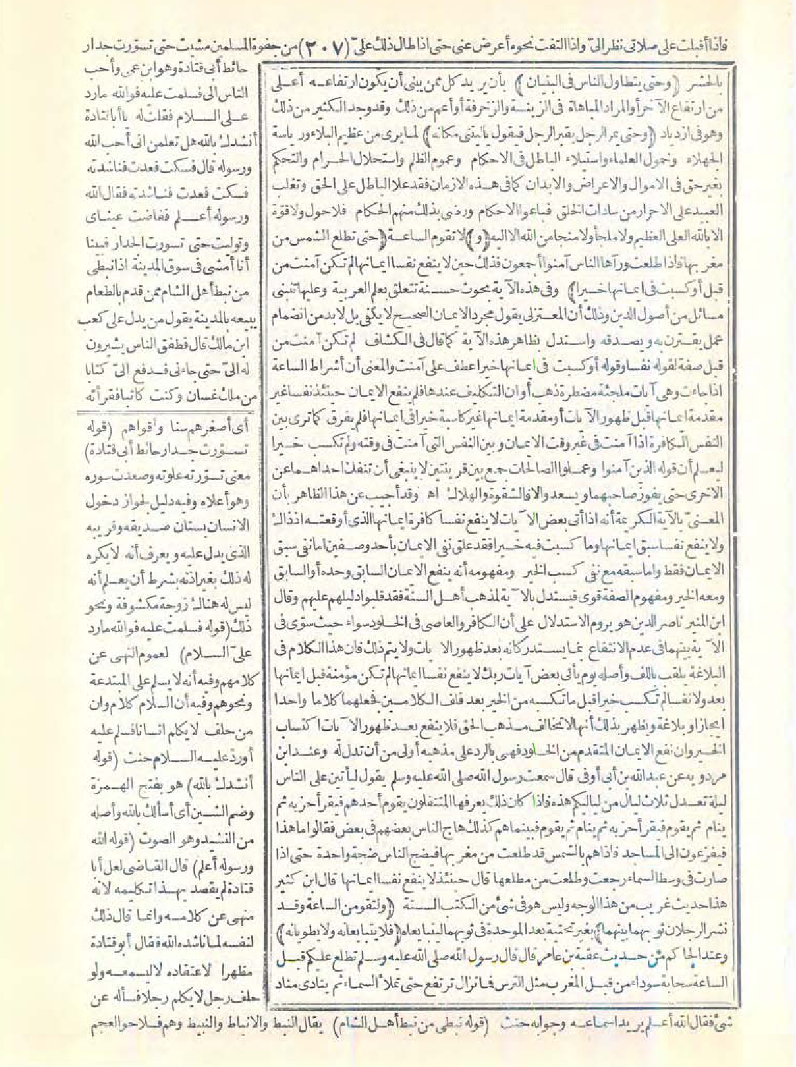 (و) لا تقوم الساعة (حتى تطلع الشمس من مغربها فإذا طلعت ورآها الناس آمنوا أجمعون فذلك حين لا ينفع نفسًا إيمانها لم تكن آمنت من قبل أو كسبت في إيمانها خيرًا) وفي هذه الآية بحوث حسنة تتعلق بعلم العربية وعليها تنبني مسائل من أصول الدين، وذلك أن المعتزلي يقول مجرد الإيمان الصحيح لا يكفي بل لا بدّ من انضمام عمل يقترن به ويصدقه، واستدلّ بظاهر هذه