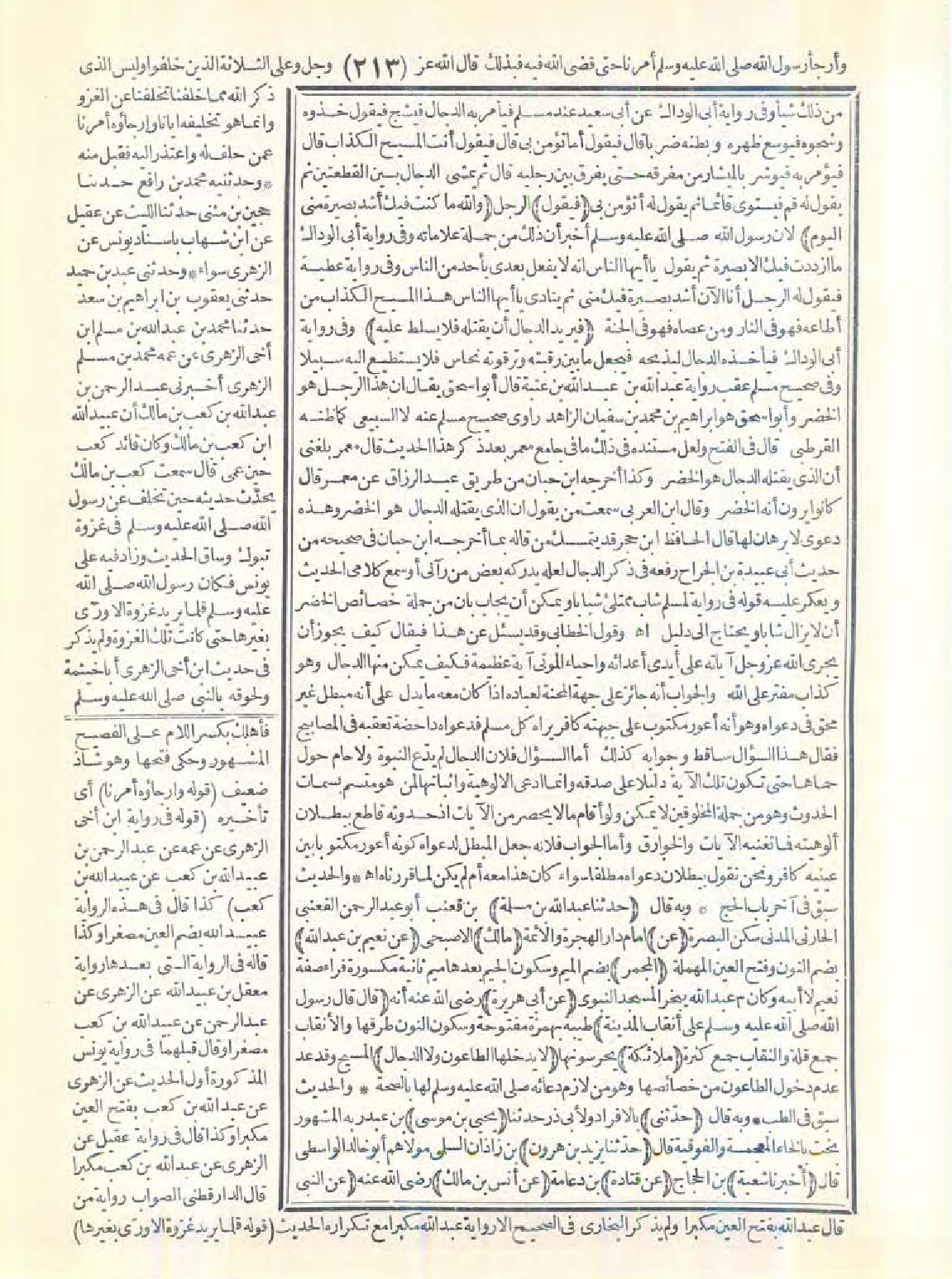 من ذلك شيئًا. وفي رواية أبي الوداك عن أبي سعيد عند مسلم فيأمر به الدجال فيشج فيقول خذوه وشجوه فيوسع ظهره وبطنه ضربًا قال فيقول أما تؤمن بي؟ قال: فيقول: أنت المسيح الكذاب. قال: فيؤمر به فيوشر بالميشار من مفرقه حتى يفرق بين رجليه. قال: ثم يمشي الدجال بين القطعتين ثم يقول له: قم فيستوي قائمًا ثم يقول له: أتؤمن بي؟ (فيقول) الرجل (والله ما كنت فيك أشد بصيرة مني اليوم) لأن رسول الله -صَلَّى اللَّهُ عَلَيْهِ وَسَلَّمَ- أخبر أن ذلك من جملة علاماته. وفي رواية أبي الوداك ما ازددت فيك إلا بصيرة ثم يقول: يا أيها الناس إنه لا يفعل بعدي بأحد من الناس، وفي رواية عطية فيقول له الرجل: أنا الآن أشد بصيرة فيك مني ثم ينادي: يا أيها الناس هذا المسيح الكذاب من أطاعه فهو في النار ومن عصاه فهو في الجنة (فيريد الدجال أن يقتله فلا يسلط عليه). وفي رواية أبي الوداك فيأخذه الدجال ليذبحه فيجعل ما بين رقبته وترقوته نحاس فلا يستطيع إليه سبيلاً. وفي صحيح مسلم عقب رواية عبد الله بن عبد الله بن عتبة قال أبو إسحاق يقال إن هذا الرجل هو الخضر وأبو إسحاق هو إبراهيم بن محمد بن سفيان الزاهد راوي صحيح مسلم عنه لا السبيعي كما ظنه القرطبي. قال في الفتح: ولعل مستنده في ذلك ما في جامع معمر بعد ذكر هذا الحديث قال معمر: بلغني أن الذي يقتله الدجال هو الخضر، وكذا أخرجه ابن حبان من طريق عبد الرزاق عن معمر قال: كانوا يرون أنه الخضر. وقال ابن العربي: سمعت من يقول إن الذي يقتله الدجال هو الخضر وهذه دعوى لا برهان لها. قال الحافظ ابن حجر: قد يتمسك من قاله بما أخرجه ابن حبان في صحيحه من حديث أبي عبيدة بن الجراح رفعه في ذكر الدجال لعله يدركه بعض من رآني أو سمع كلامي الحديث ويعكر عليه قوله في رواية لمسلم شاب ممتلئ شبابًا ويمكن أن يجُاب بأن من جملة خصائص الخضر أن لا يزال شابًّا ويحتاج إلى دليل اهـ.