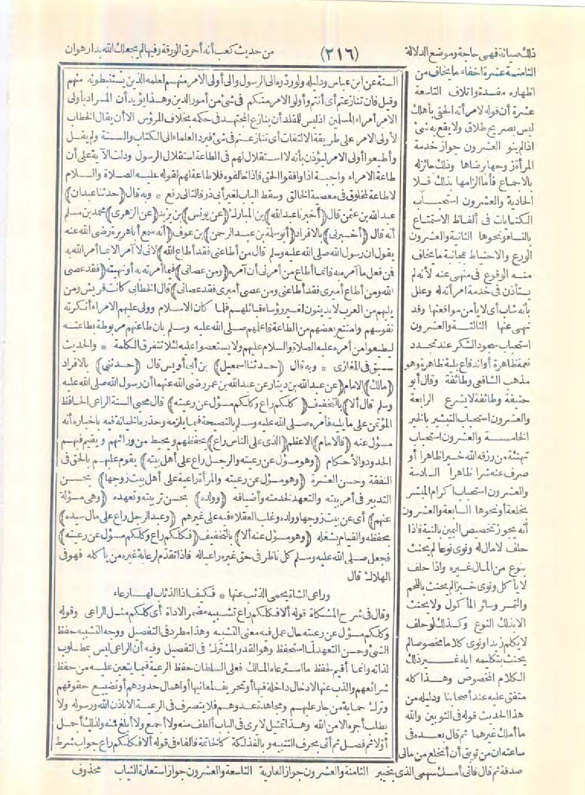 وقال في شرح المشكاة قوله: ألا فكلكم راعٍ تشبيه مضمر الأداة أي كلكم مثل الراعي، وقوله: وكلكم مسؤول عن رعيته حال عمل فيه معنى التشبيه وهذا مطّرد في التفصيل، ووجه التشبيه حفظ الشيء وحسن التعهد لما استحفظ وهو القدر المشترك في التفصيل، وفيه أن الراعي ليس بمطلوب لذاته، وإنما أقيم لحفظ ما استرعاه المالك فعلى السلطان حفظ الرعية فيما يتعين عليه من حفظ شرائعهم والذب عنها لإدخال داخلة فيها أو تحريف لمعانيها أو إهمال حدودهم أو تضييع حقوقهم وترك حماية مَن جارَ عليهم ومجاهدة عدوّهم فلا يتصرف في الرعية إلا بإذن الله ورسوله ولا يطلب أجره إلا من الله، وهذا تمثيل لا يرى في الباب ألطف منه ولا أجمع ولا أبلغ منه، ولذلك أجمل أوّلاً ثم فصل ثم أتى بحرف التنبيه وبالفذلكة كالخاتمة فالفاء في قوله: ألا فكلكم راع جواب شرط