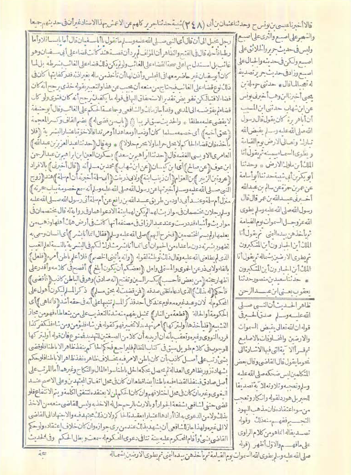 رجل بخيل إلى أن قال أي النبي -صَلَّى اللَّهُ عَلَيْهِ وَسَلَّمَ-: "ما تقول يا أبا سفيان"؟ قال: أما يابسًا فلا وأما رطبًا فأحله، قال في الفتح: والظاهر أن المؤلّف لم يرد أن قصة هند كانت قضاء على أبي سفيان وهو غائب بل استدلّ بها على صحة القضاء على الغائب ولو لم يكن ذلك قضاء على الغائب بشرطه بل لما كان أبو سفيان غير حاضر معها في المجلس وأذن لها أن تأخذ من ماله بغير إذنه قدر كفايتها كان في ذلك نوع قضاء على الغائب فيحتاج من منعه أن يجيب عن هذا التعبير بقوله: خذي يرجح أنه كان قضاء لا فتيا لكن تفويض تقدير الاستحقاق إليها في قوله: ما يكفيك يرجح أنه كان فتوى ولو كان قضاء لم يفوّضه إلى المدعي، وقد أجاز مالك والشافعي وجماعة الحكم على الغائب، وقال أبو حنيفة: لا يقضي عليه مطلقًا.