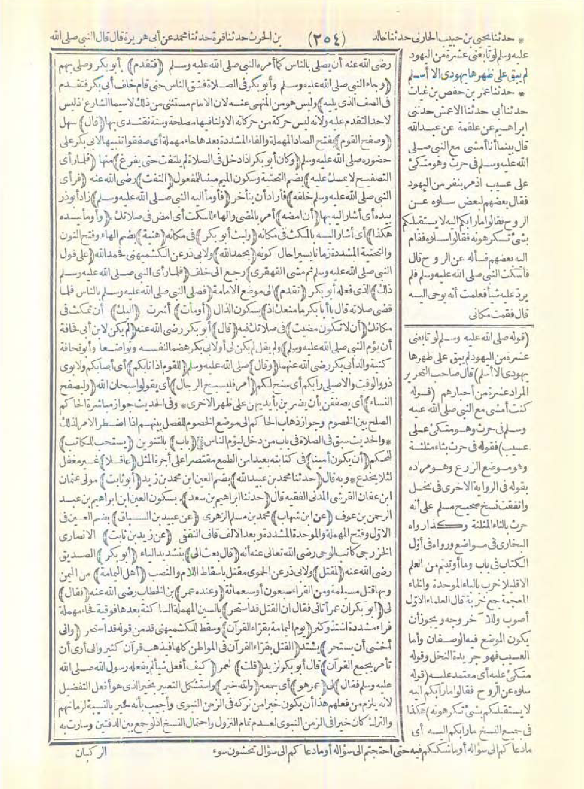 -رضي الله عنه- أن يصلّي بالناس كما أمره النبي -صَلَّى اللَّهُ عَلَيْهِ وَسَلَّمَ- (فتقدم) أبو بكر وصلى بهم. (وجاء النبي -صَلَّى اللَّهُ عَلَيْهِ وَسَلَّمَ- وأبو بكر في الصلاة فشق الناس حتى قام خلف أبي بكر فتقدّم في الصف الذي يليه) وليس هو من المنهي عنه لأن الإمام مستثنى من ذلك لا سيما الشارع إذ ليس لأحد التقدّم عليه ولأنه ليس حركة من حركاته إلا ولنا فيها مصلحة وسُنّة نقتدي بها (قال) سهل (وصفح القوم) بفتح الصاد المهملة والفاء المشددة بعدها حاء مهملة أي صفقوا تنبيهًا لأبي بكر على حضوره -صَلَّى اللَّهُ عَلَيْهِ وَسَلَّمَ- (وكان أبو بكر إذا دخل في الصلاة لم يلتفت حتى يفرغ) منها (فلما رأى التصفيح لا يمسك عليه) بضم التحتية وسكون الميم مبنيًّا للمفعول (التفت) -رضي الله عنه- (فرأى النبي -صَلَّى اللَّهُ عَلَيْهِ وَسَلَّمَ- خلفه) فأراد أن يتأخر (فأومأ إليه النبي -صَلَّى اللَّهُ عَلَيْهِ وَسَلَّمَ-) زاد أبو ذر بيده أي أشار إليه بها (أن امضه) أمر بالمضي والهاء للسكت أي امض في صلاتك (وأومأ بيده هكذا) أي أشار إليه بالمكث في مكانه (ولبث أبو بكر) في مكانه (هنية) بضم الهاء وفتح النون والتحتية المشددة زمانًا يسيرًا حال كونه (يحمد الله) ولأبي ذر عن الكشميهني فحمد الله (على قول النبي -صَلَّى اللَّهُ عَلَيْهِ وَسَلَّمَ- ثم مشى القهقرى) رجع إلى خلف (فلما- رأى النبي -صَلَّى اللَّهُ عَلَيْهِ وَسَلَّمَ- ذلك) الذي فعله أبو بكر (تقدم) إلى موضع الإمامة (فصلّى النبي -صَلَّى اللَّهُ عَلَيْهِ وَسَلَّمَ- بالناس فلما قضى صلاته قال):